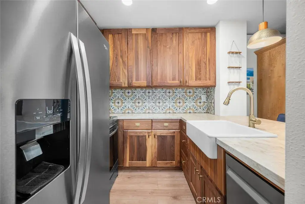 ***LAKEVIEW STUDIO*** Welcome to El Dorado Lakes, a truly special community on the border of Long Beach and Los Alamitos where Fully remodeled modern comfort meets timeless charm. Set amidst meandering waterways, lush landscaping, sparkling pool, this serene, resort-style enclave offers an idyllic escape from the everyday. This stunningly remodeled lower-level studio end unit perfectly embodies warmth and sophistication, featuring an open and spacious layout with a gorgeous kitchen showcasing sleek quartzite countertops, stainless steel appliances, and modern shaker cabinetry that flows seamlessly into the dining and living areas. Accent lighting adds a soft, inviting ambiance throughout. The fully updated bathroom features a frameless glass shower enclosure and designer finishes that elevate the space with a spa-like touch. A large walk-in closet provides ample storage, while the private deck offers tranquil lake views—a perfect retreat for morning coffee or peaceful sunset reflection. Step outside to your own garden patio overlooking lily pad ponds and enjoy the soothing sounds of nature in this truly enchanting setting. Additional highlights include covered parking with storage, generous guest parking, and the peace of mind that comes with a gated, pet-friendly community. Spanning over 11 acres of lush, park-like grounds, El Dorado Lakes is a hidden gem featuring streams, lakes, and vibrant wildlife. Community amenities include a pool, spa, sauna, tennis courts, and a recreation lounge with billiards. Just steps from El Dorado Park, residents can enjoy nature trails, a dog park, golf course, and nature center—with a bike path leading all the way to the beach. Conveniently located near dining, shopping, and the 605 freeway, this home offers Southern California living at its finest—modern, timeless, and irresistibly cozy. Condo can be sold furnished or unfurnished.