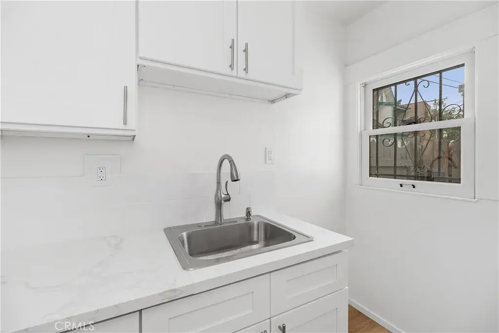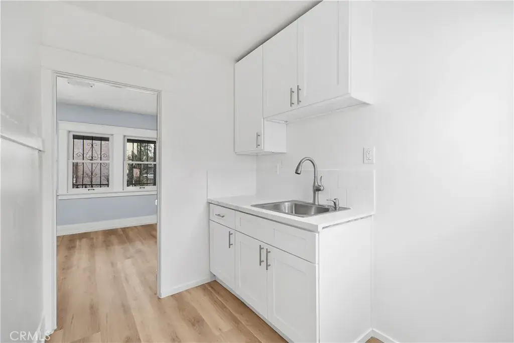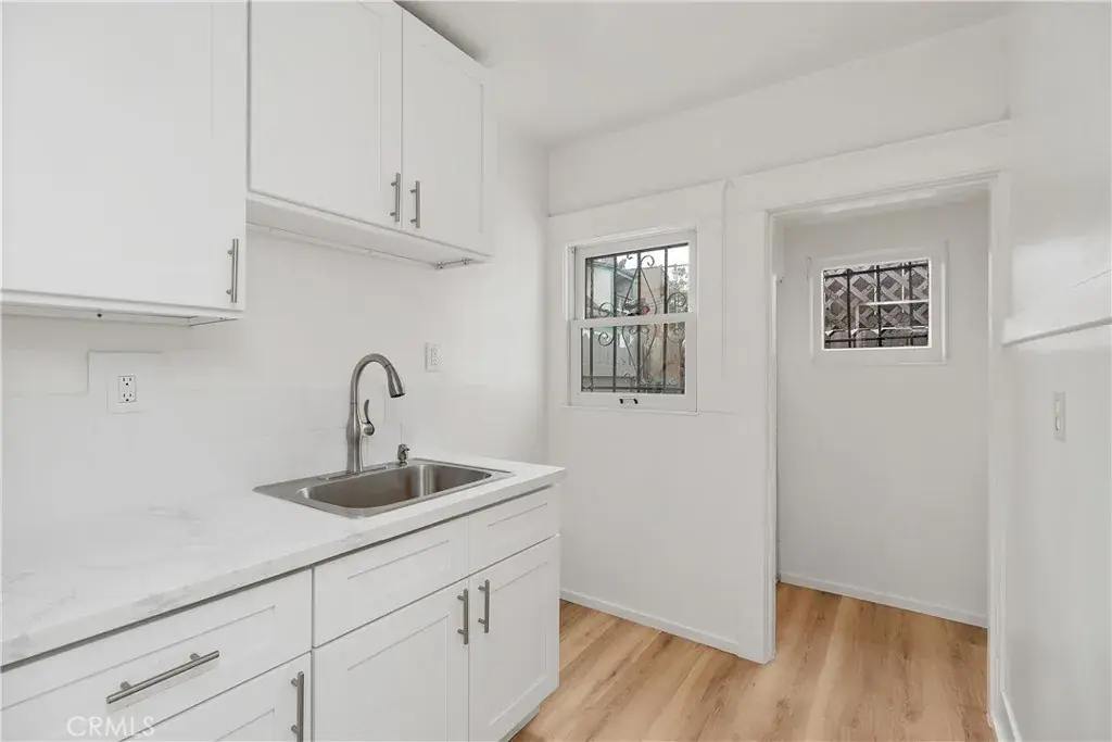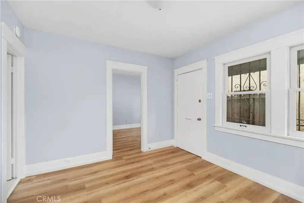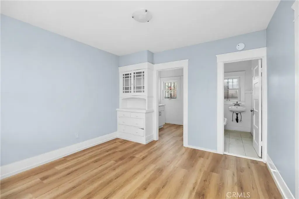 Behind the front house, you’ll find four (4) additional 1-bedroom, 1-bath units, each with its own covered front porch—perfect for enjoying Long Beach’s coastal breeze. One of these units was just beautifully remodeled and is now vacant, ready to welcome a new tenant or even a potential owner. The remodeled unit features wide plank light oak laminate flooring, custom built-in cabinetry in the living room, crisp white shaker kitchen cabinets, elegant quartz countertops, and stylish five-panel shaker doors. With new plumbing and abundant natural light, this unit stands out as a bright and modern living space, showcasing the possibilities with the remaining units.