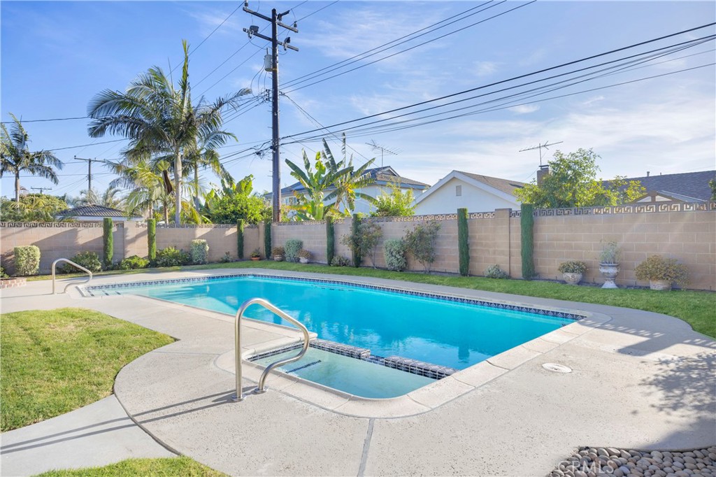 The primary bedroom at the back of the house offers privacy and convenience, with a back door that opens directly to the sparkling pool, ideal for easy access to outdoor relaxation and fun.