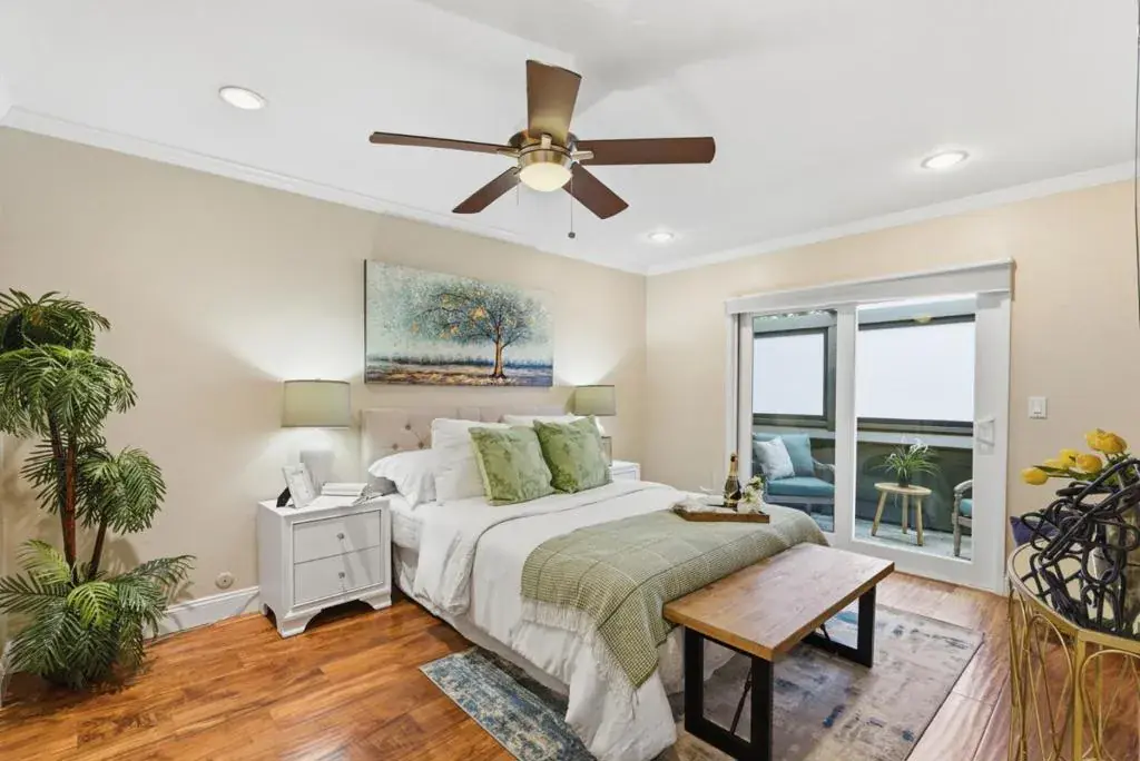 Ideally situated only moments from downtown Los Altos, this top-level condo offers spacious living. Walk through a manicured courtyard before reaching a sun-drenched interior, where warm, planked flooring extends across the living room. Relax around the brick-lined fireplace adorned with ornate tiling before making your way to the gourmet kitchen with ample cabinetry, a large breakfast bar, and stainless steel appliances. Spend evenings perfecting your favorite meals in this culinary space before enjoying them in the formal dining area, lit by recessed lighting, while fresh air flows in from two airy balconies. A hallway leads to two versatile guest bedrooms, a full bathroom, and a primary suite with a private balcony and a pristine ensuite featuring optimal storage and a glass-encased walk-in shower. In-unit laundry, a garage, reserved parking, and an unbeatable location near local restaurants, shopping, and prestigious Los Altos schools only add to the appeal of this serene home. **Some photos have digitally altered elements for marketing purposes.**