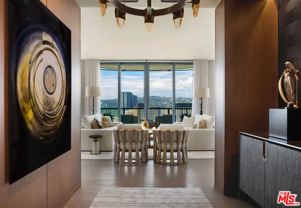 A custom-designed residence by McRae Lambert & Dunn, Residence 26C at the prestigious Century Plaza Park Elm is a one-of-a-kind one-bedroom plus den, offering unparalleled panoramic views to the north and east, facing the Wilshire Corridor and Downtown LA skyline. Upon arrival through a private elevator vestibule, you are welcomed by a grand formal entry foyer that flows into an expansive great room with 10-ft tall floor to ceiling windows. The den features rich walnut paneling and a travertine gas fireplace, creating an atmosphere of warmth and refined sophistication. The Snaidero-designed kitchen is equipped with Miele appliances and a custom slab waterfall island, blending sleek design with exceptional functionality. All rooms have operable windows which is unique in high-rise living. The primary suite offers dual custom Italian-designed closets and a luxurious five-fixture en-suite bath. Smart home features include Dual AC control, a Lutron lighting system and Palladium motorized shades. Residents enjoy world-class amenities including a resort-style pool, state-of-the-art fitness center, steam-equipped locker rooms, screening room, library, game room, personal wine storage, private dining rooms, guard-gated entry, and 24-hour concierge service.