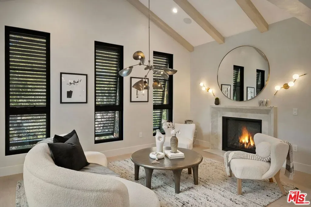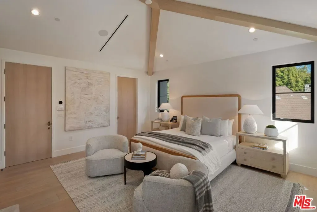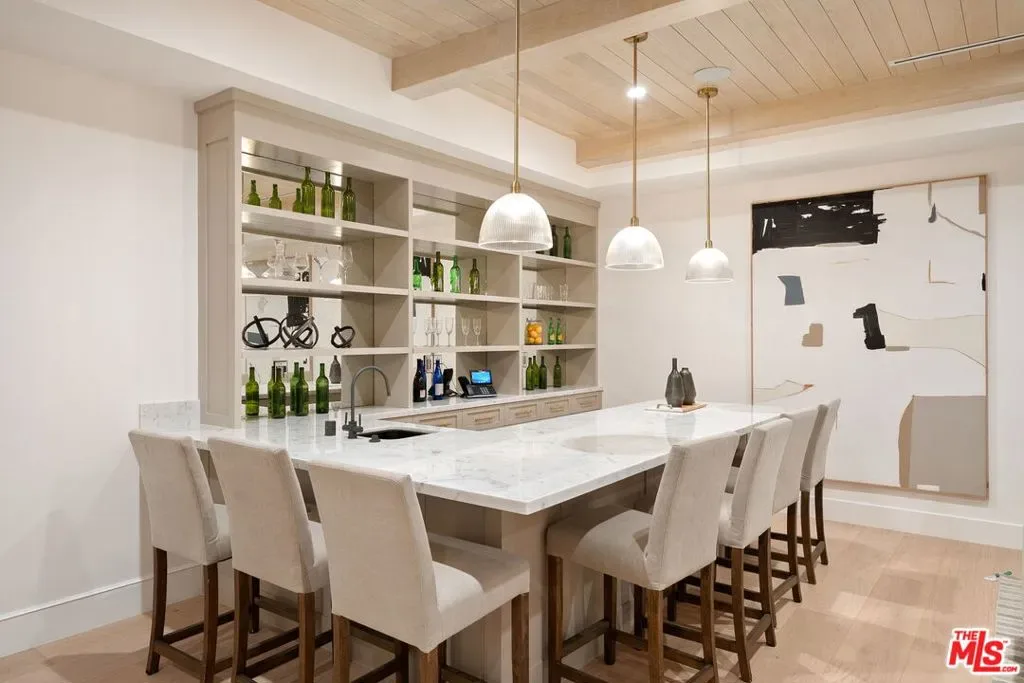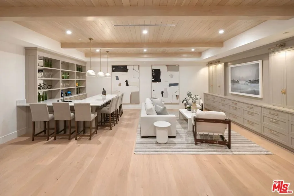 Exceptional custom residence blending contemporary sophistication with timeless elegance. Interiors feature wide-plank oak floors, natural wood elements, and a refined mix of slab finishes and custom cabinetry. The chef’s kitchen is appointed with Sub-Zero refrigeration, Bluestar range, and a Miele espresso maker, opening to a soaring family room with double-height ceilings and walls of glass. Resort-style outdoor living includes a pool, ADU, built-in BBQ and beverage center, fire pit beneath the pergola, and landscaped grounds with a private entry water feature. Additional highlights: state-of-the-art theater, finished basement with gym, temperature-controlled wine cellar, home automation, elevator to all levels, two laundry rooms, a second Miele espresso maker in the primary suite, and three-car garage. A rare opportunity to own a thoughtfully designed estate offering luxury, comfort, and style in one of Los Angeles’ most coveted neighborhoods.