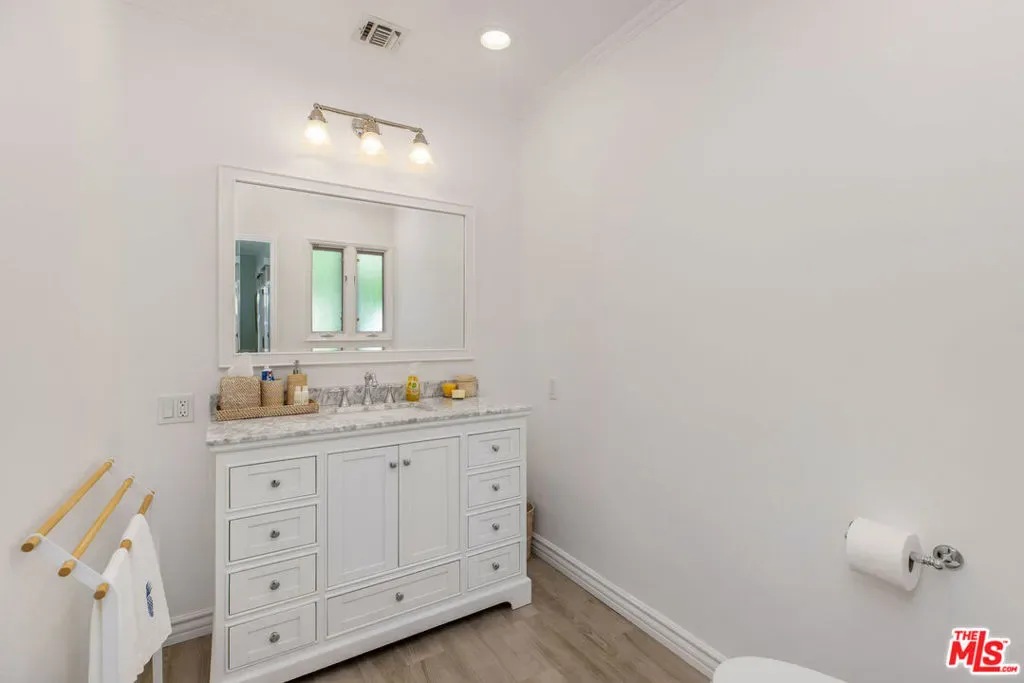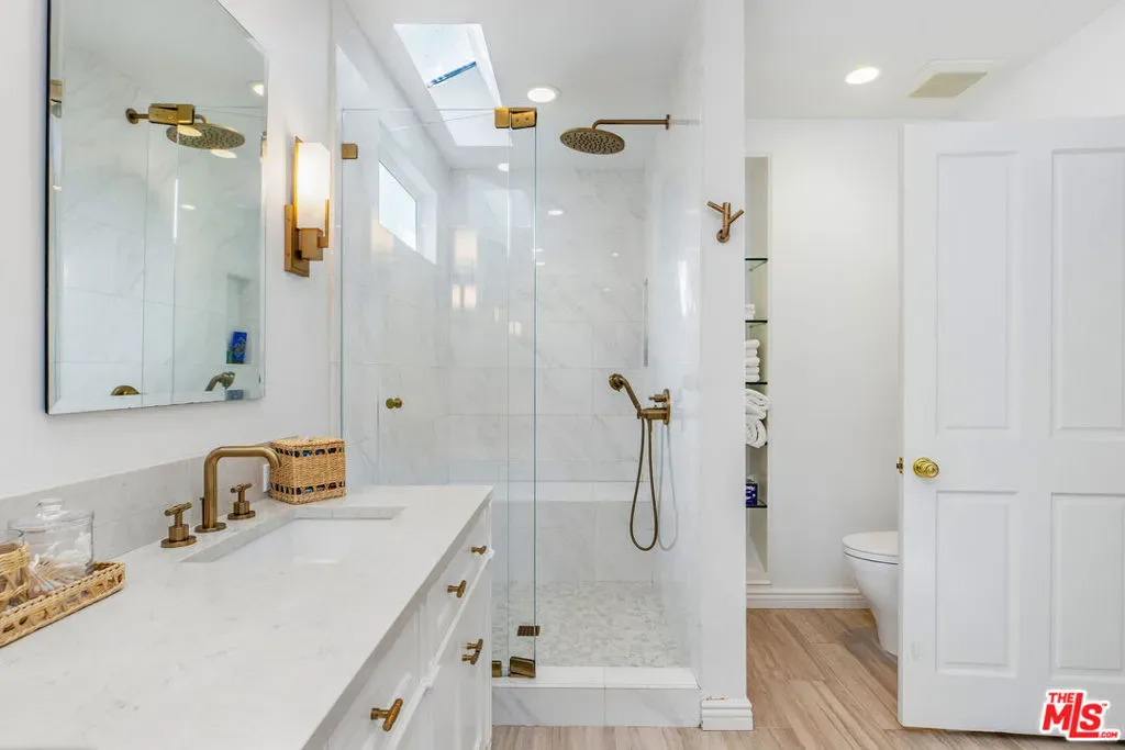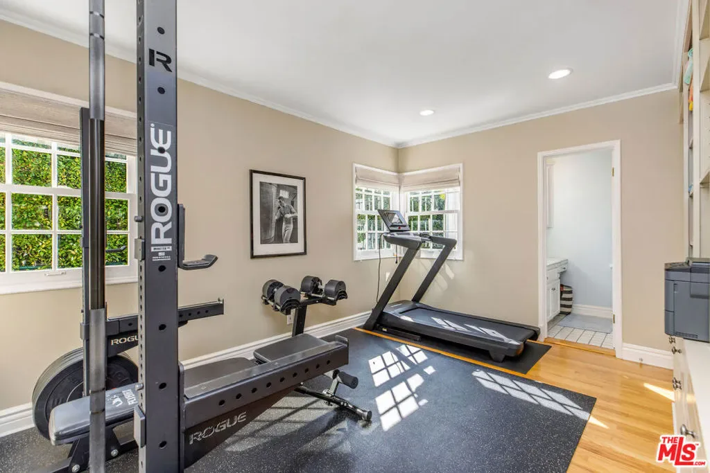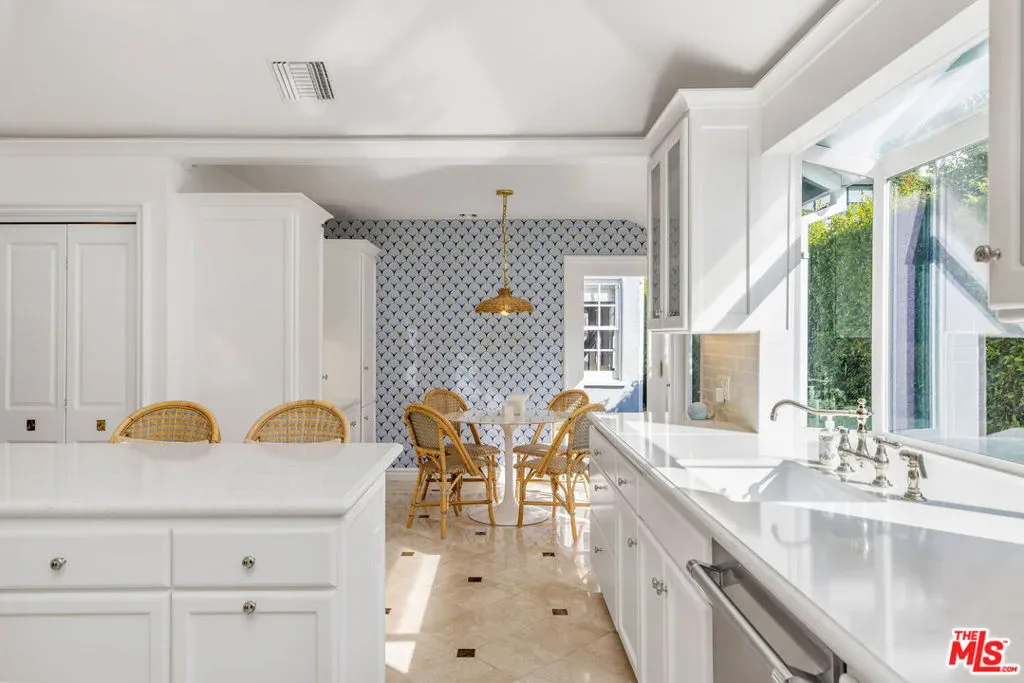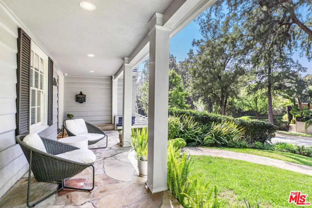 Set up slightly from the street, this single-level, extensively remodeled Traditional home offers a rare opportunity to own a move-in ready property in the prestigious Little Holmby neighborhood of Westwood. Upon stepping into the formal entry from the covered porch, you find a cheery and welcoming home with hardwood floors throughout and natural light streaming in through every room. On one side is a grand formal living room with a stately fireplace, soaring cathedral ceilings, numerous sky lights, and French doors leading to the patio. On the other side is a stately formal dining room with tree-top views encouraging fabulous dinner parties late into the night. Adjoining the dining room is an inviting and updated gourmet kitchen beckoning to the aspiring chef or trained professional. Features include high-end stainless appliances, built-in microwave, wine cooler, white granite counters, multiple workspaces, bay window, bar seating and eat-in breakfast area. The other public areas in the front of the house include a bright separate study/office with glass door to the outside, welcoming family room with peaked, exposed wood ceiling, sliding doors, warm fireplace, and a lovely powder room. The three bedrooms comprise the rear portion of the house with ensuite baths offering total privacy and comfort. The two family bedrooms are generous in size and have copious amounts of closet space. The primary bedroom is a tranquil escape from the hectic world outside with raised ceilings, fireplace, sumptuous bath, large closet and direct access to the pool. The convivial exterior areas are just the icing on the cake for this wonderful home. Accessible from the living room, office, family room and one bedroom is an amazing, private patio bordered by mature landscaping featuring an outdoor kitchen plus barbeque, partially covered dining or seating area and babbling fountain adding just the right touch of atmosphere. This is the space where you will spend all your time entertaining friends for al fresco parties, catching up with family over a glass of wine or curling up with a good book and enjoying the serenity. Additionally, there is a sparkling pool at the back beckoning all to come and enjoy a playful afternoon of water sports. The house also has a lower direct access garage with a storage area lined with shelves and closets perfect for immediate storage after a successful Costco run and laundry area with laundry chute from above. Located just minutes away from the relaxing atmosphere at Holmby park, the world-class shopping at Century City Westfield mall, the glamour of Beverly Hills, the vibrant nightlife of West Hollywood, the cultural offerings of UCLA/Westwood and the prestigious, award-winning Warner Avenue elementary school, this is the house you have been waiting for.