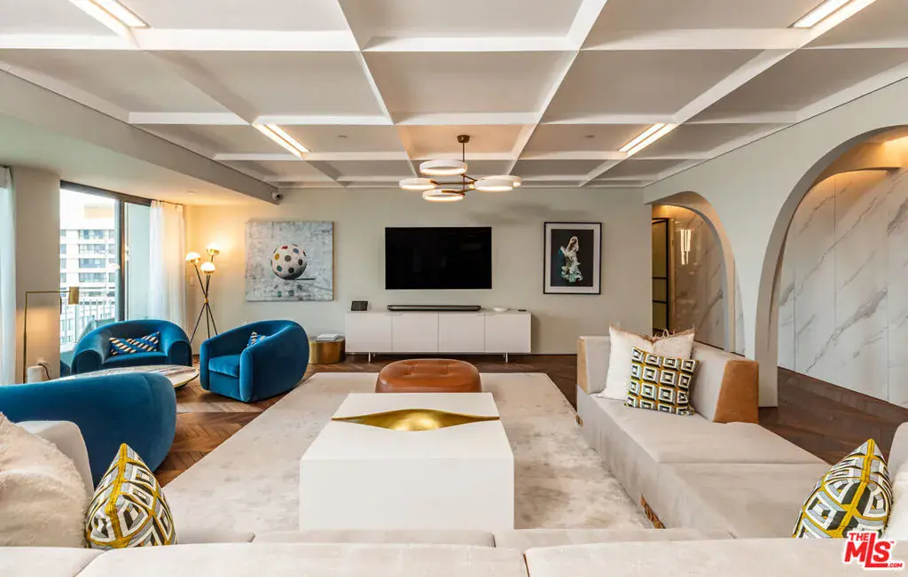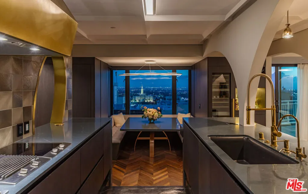 Turnkey Designer Furnished Condominium. Nestled within the distinguished Remington Private Residence Tower in Westwood and following a three-year gut renovation, this exquisitely designed 3/4 bedroom, 3.5 bathroom condominium is a masterclass in modern luxury and timeless sophistication in pristine move-in condition. Complete furnishings available for purchase, including custom-made furniture, designer lighting and chandeliers, custom rugs, Frette linens, comprehensive AV system, window coverings, extensive kitchen cookware, appliances and flatware. Encompassing 3,283 square feet, the home welcomes you from your Private Elevator directly into your gracious formal foyer, unfolding into a sun-drenched, open-concept living space framed by floor-to-ceiling windows and an extensive terrace that captures breathtaking panoramas of the city skyline. The interiors unfold with an artful balance of drama and refinement. Rich chevron-patterned hardwood floors and custom coffered ceilings guide you to the striking black marble gourmet kitchen, where bold design meets everyday functionality. State-of-the-art Miele appliances, a walk-in pantry, and a custom breakfast nook create an inviting space that transitions effortlessly from quiet morning rituals to vibrant gatherings. The adjacent office/den/4th bedroom outfitted with bespoke cabinetry and sliding glass doors, doubles as a versatile sanctuary with access to a private terrace. A dedicated laundry room and extensive storage add convenience. A marble-clad hallway leads to a serene guest suite, designed with privacy and comfort in mind. On the opposite wing, the primary suite defines luxury living. An entryway lined with mirrored panels sets the tone, while recessed and paneled custom ceilings and expansive windows frame the glittering cityscape. The suite extends to a private terrace, a tranquil haven from which to savor the views. The ensuite bathroom is a spa-like retreat, featuring a stone-clad walk-in shower, a deep soaking tub, a private infrared sauna, and a custom dressing room that rivals the most elegant ateliers. An additional ensuite guest suite and formal powder room complete the home. Throughout, thoughtful design details -architectural arches, custom contemporary finishes, and discreet hidden storage – imbue the residence with an air of bespoke sophistication, where every inch has been meticulously curated. Modern conveniences such as a Crestron smart-home system, automated shades, and custom lighting ensure effortless living, seamlessly blending luxury and technology. As part of the two dedicated parking spaces, a coveted submeter purchased for a private EV charger. Additional separate storage room and wine locker are included. More than a residence, this exceptional offering sets a new standard for vertical living in Los Angeles’ most coveted address- a harmonious fusion of artistry, design, and comfort. Residents of The Remington enjoy unparalleled amenities synonymous with elevated living: 24-hour valet parking, a stately library and fireside lounge, a grand banquet hall, an outdoor pool, a state-of-the-art fitness center, and expansive alfresco dining areas complete with a cozy outdoor fireplace.