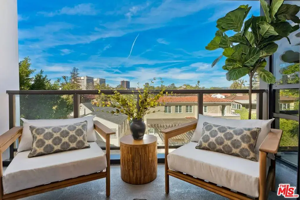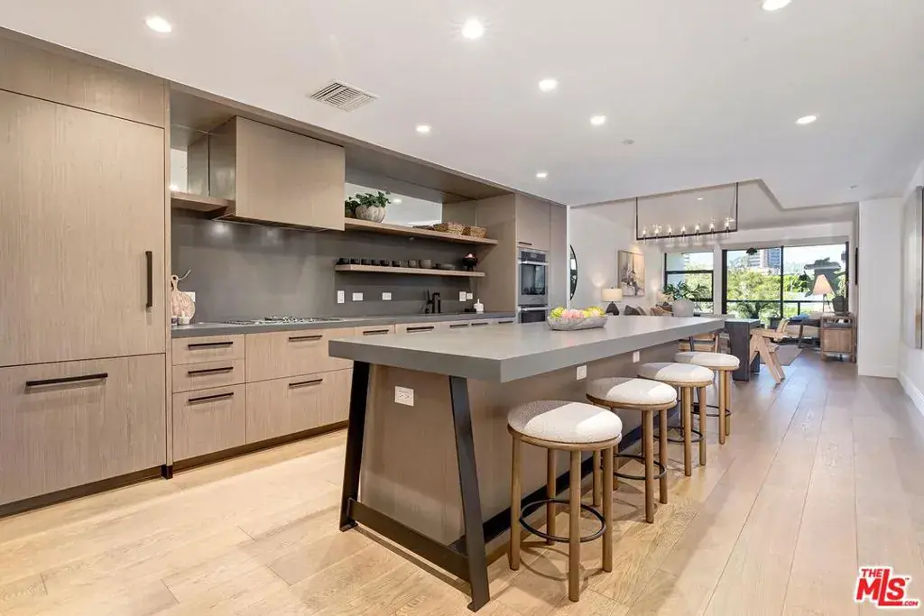 Welcome home to this luxurious contemporary 2-bedroom, 2-bathroom REAR CORNER unit condominium at The Liddel on the Wilshire Corridor. The kitchen is a true centerpiece: a generous island with bar stools anchors the space, ideal for both casual mornings and elevated entertaining. Miele appliances, a wine refrigerator, custom cabinetry, and wide-plank white oak floors throughout complete the picture. The primary suite features a spacious walk-in closet. Enjoy a private balcony overlooking Holmby Hills and Bel Air. The Liddel offers 24-hour concierge and valet, EV charging stations, club lounge with bar, wine room, catering kitchen with private dining room, fitness studio, garden lounge, and a rooftop sky deck with barbecues and panoramic city views. Earthquake insurance is included in the HOA dues. Conveniently located near UCLA, Beverly Hills, Century City, and the 405.