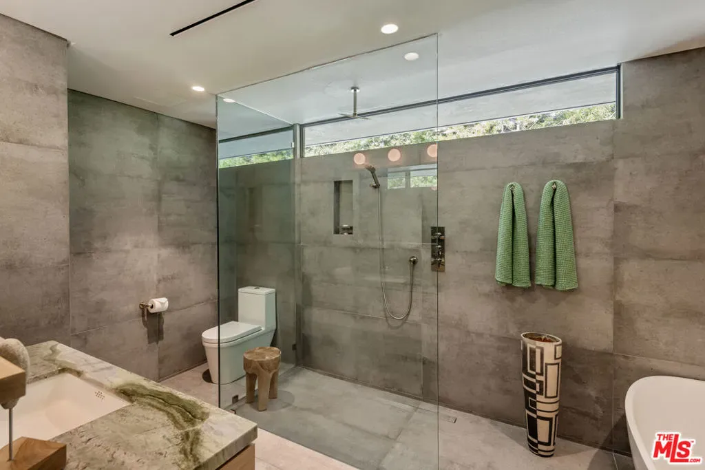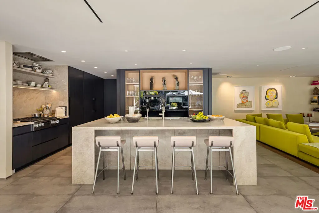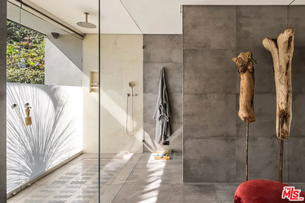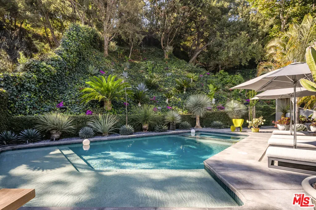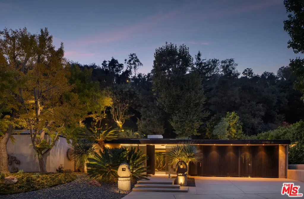 Recently reimagined with a focus on materiality, light, and flow, this refined mid-century residence offers a quiet, design-forward retreat framed by lush, zen-inspired grounds by landscape architects Garett Carlson and Mark Levine. Beyond a gated entry, Venetian plaster walls and expansive floor-to-ceiling glass create a soft interplay of light and shadow throughout, while the formal living room anchored by a striking bronze mirror fireplace, opens entirely to the outdoors — blurring the line between architecture and landscape. The kitchen balances precision and restraint with a full suite of Miele appliances, Wolf range, custom cabinetry, and stone surfaces, complemented by a glassware showcase and bar that flows into a secondary living area. A dedicated wine lounge with full bath, sculptural powder room, and separate laundry complete the interior, all designed for seamless indoor-outdoor living. Outside, a series of curated spaces unfold from the pool and spa to the alfresco kitchen, dining deck, and fire pit lounge set within layered greenery for complete privacy. The primary suite opens directly to the grounds and features a dramatic two-level dressing room and spa-like bath with Italian onyx vanities and rainfall shower, while a secondary suite and flexible third room offer versatility. Fully updated between 2020 and 2023 with new systems, solar, and HVAC, the home is a cohesive expression of modern comfort and timeless design.
