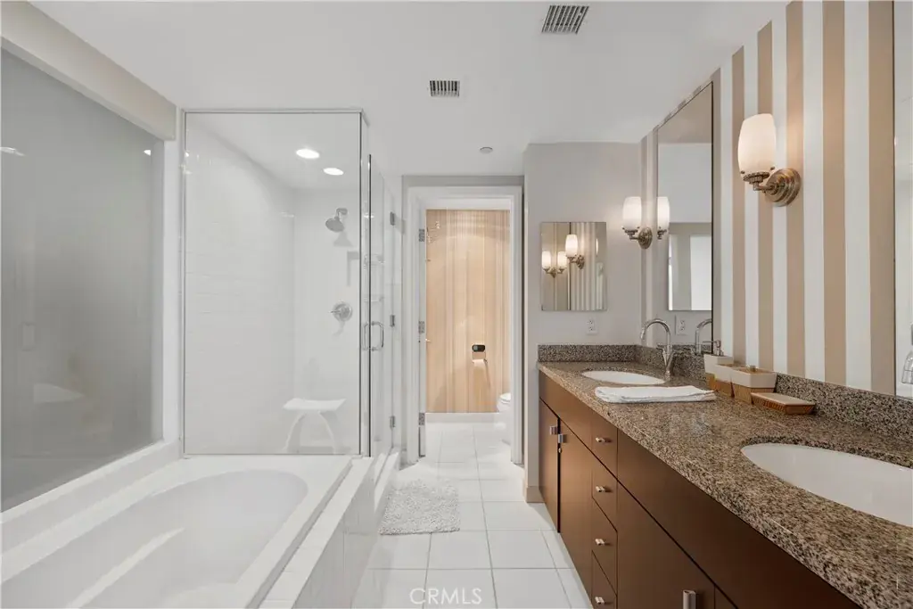 This 1 bed, 2 bath loft spans approximately 1,080 sq. ft., showcasing soaring ceilings, dramatic floor-to-ceiling windows, and modern hardwood flooring. The open-concept kitchen features granite countertops, European-style cabinetry, and GE Profile stainless steel appliances. The upper-level bedroom includes a spacious walk-in closet and a spa-inspired ensuite with a soaking tub, dual vanities, and a separate shower.