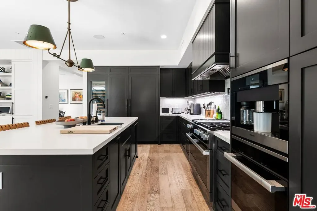 Chic, designer-done traditional on a large 6,000 sq. ft. lot in the coveted Brentwood Glen community! Built in 2021 and thoughtfully executed with a refined transitional aesthetic, this sophisticated, private, and gated residence sits on a true cul-de-sac street and offers over 3,145 sq. ft. of beautifully curated living space, complete with a stunning backyard oasis featuring a pool and jacuzzi with electric cover. Upon entering this striking two-story home, you’re immediately drawn to the wide-plank wood floors, detailed millwork, curated lighting, and clean architectural lines that create warmth and understated luxury throughout. The layout is open yet intentional, with soaring ceilings and expansive sliding doors that flood the interiors with natural light. The fully appointed chef’s kitchen is both functional and impressive, showcasing Sub-Zero refrigeration and wine storage, a Miele six-burner range with grill top, Miele coffee system, warming drawer, oversized island with seating, abundant pantry space, and a custom built-in breakfast nook. The space flows effortlessly into the spacious family room, creating a seamless indoor-outdoor connection to the outdoor dining area ideal for entertaining and everyday living. A private first-floor suite with separate entrance, en-suite bath, and a walk-in closet, offers flexibility for guests, multigenerational living, or a dedicated office. Upstairs, you’ll find well-proportioned secondary bedrooms and a substantial bonus room currently designed as a playroom easily functioning as a fifth bedroom, media room, or executive workspace. The primary suite is a true retreat, featuring a spa-inspired bath with dual vanities, freestanding soaking tub, walk-in shower, and a generous custom walk-in closet. Adding to the home’s functionality, half of the garage has been thoughtfully converted into a fully equipped gym, complete with mirrored walls and built-in space for workout equipment creating a private, at-home fitness studio while still maintaining garage utility. The backyard is designed for year-round enjoyment, anchored by a sleek rectangular pool and jacuzzi, expansive grassy yard, and a covered outdoor dining area with heaters perfect for gatherings, summer evenings, and everyday family life. A gated entry and built-in basketball hoop complete the property, blending luxury with livability. Don’t miss the opportunity to own a truly designer-executed home in a family-friendly neighborhood on a quiet cul-de-sac in the highly sought-after Kenter Canyon School District!