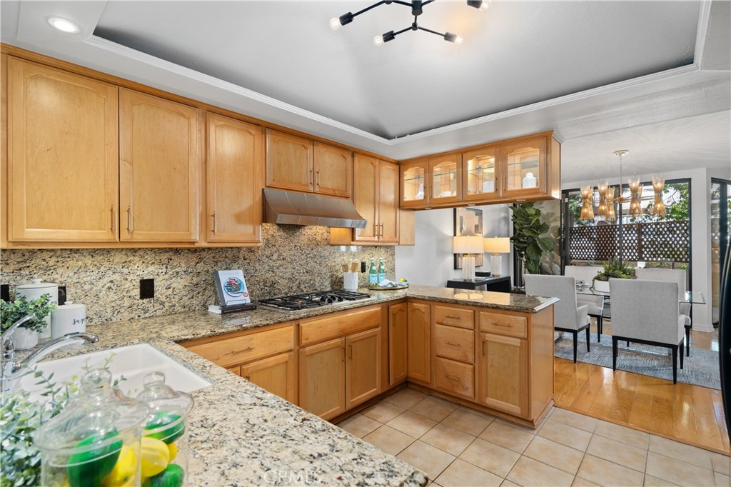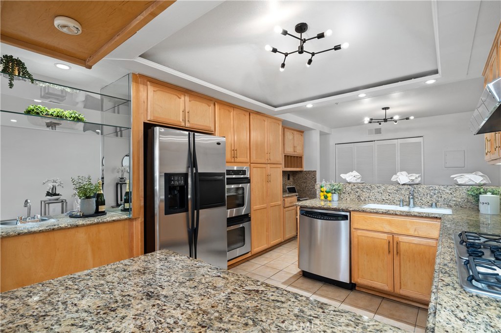 A built in bar with a sink connects the living areas to the kitchen for effortless entertaining. The kitchen features glass front cabinetry with integrated lighting, dual ovens, refrigerator, granite countertops, stainless hood, GE Profile cooktop, coffered ceiling with integrated lighting, and breakfast bar seating. The adjacent multi purpose nook includes a built in work desk and flexible space ideal for a home office, creative studio, or casual dining.