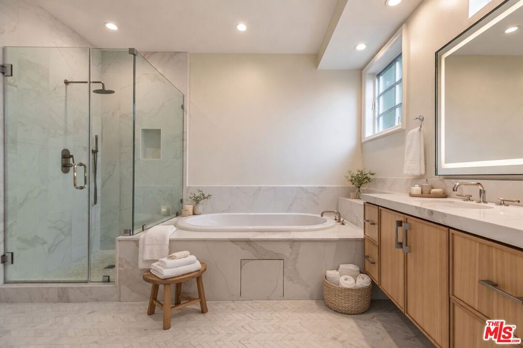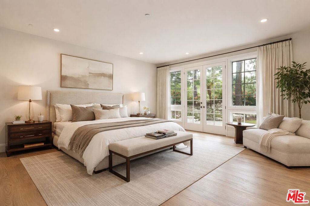 Set within the exclusive, privately gated enclave of Bel Air Crest, this recently upgraded residence offers refined living with thoughtful modern enhancements. At the heart of the home is a newly designed gourmet chef’s kitchen, appointed with premium Wolf appliances, dual ovens, a Thermador refrigerator, and a 30-bottle wine refrigerator seamlessly connected to an elegant and spacious great room ideal for entertaining and everyday living. New hardwood floors flow throughout, while expansive windows fill the living spaces with natural light, accentuating soaring ceilings and an airy ambiance. The main level includes a private guest suite with full bath and a dedicated laundry room with sink. Downstairs, the serene primary suite features a generous walk-in closet, a beautifully appointed bathroom, and direct access to the backyard patio surrounded by mature trees and lush landscaping. Two additional full-size bedrooms (optional den) offer flexible space for guests, a home office or playroom, each with built-in cabinetry. HOA amenities include a private clubhouse with fitness center, tennis and basketball courts, putting green, and a resort-style pool and spa, along with a playground, dog park, scenic trails, and 24/7 security patrol.