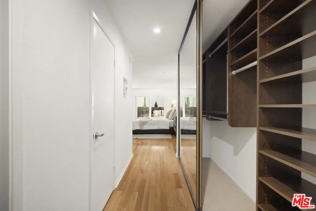 At 11954 Goshen Avenue, in a discreet pocket of Brentwood, both walkable and quiet, this tri-level 1-bedroom plus office/guest loft, 2-bath townhome offers two private outdoor spaces, soaring ceilings, and an oversized primary suite. Spanning 1,020 square feet, the residence unfolds in a fluid plan with hardwood floors throughout, lending warmth and continuity to the interiors. The living room, anchored by a floor-to-ceiling fireplace that suggests evenings of low light and long conversation, has the space to entertain and opens to a private balcony to enjoy evening drinks and morning coffees. The fully updated kitchen offers stainless steel appliances, quartz countertops, and a wine fridge. The bathrooms are clean and modern; crisp lines, thoughtful finishes, and a sense of utility refined rather than merely functional. A second loft-style room has been used as both a guest bedroom and office. Every detail serves a purpose. Air conditioning units on every level offer year-round comfort. An in-unit washer and dryer, multiple large storage spaces, and two covered parking spots with guest parking provide the ultimate convenience. What distinguishes this Goshen Avenue home is not extravagance but balance: comfort without excess, sophistication without display, and close proximity to grocery stores, restaurants, gyms, and more. It is a residence attuned to the rhythms of Los Angeles living, a private retreat in the heart of the city. OFFER DEADLINE: TUESDAY 3/31 @ 12:00 PM
