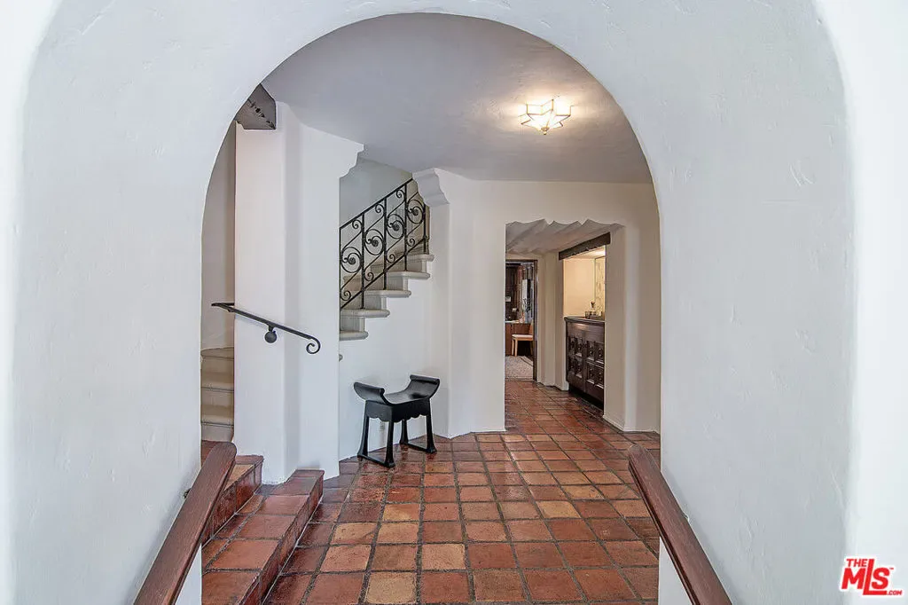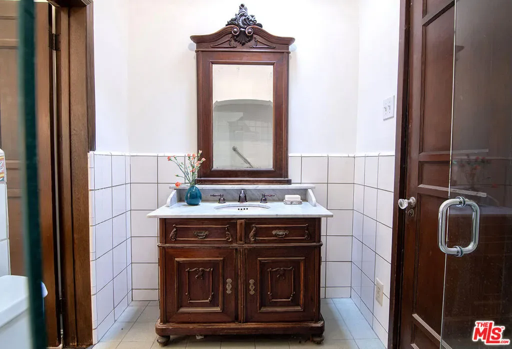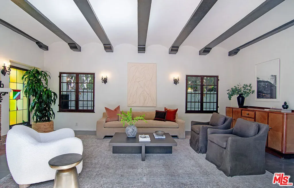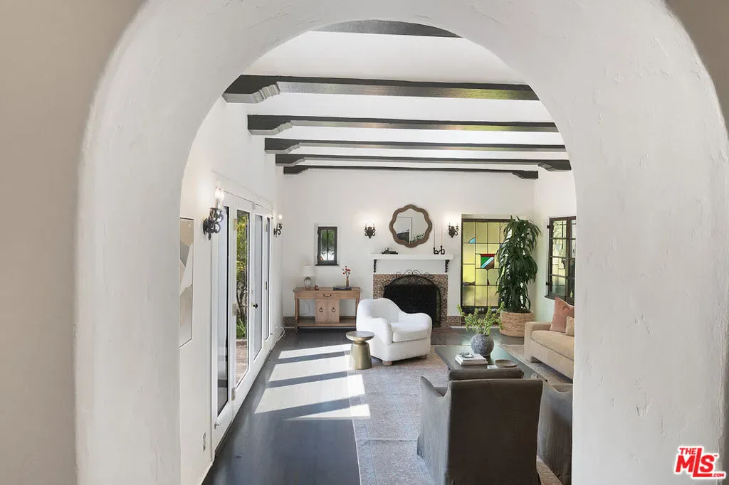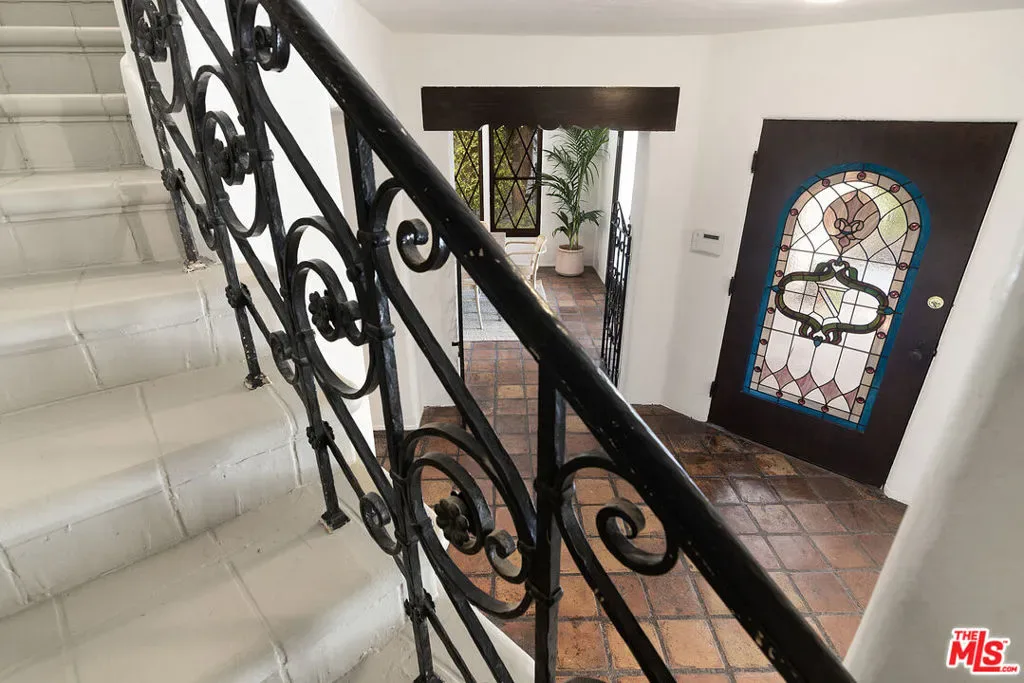Emotional 2 Story Courtyard Miracle Mile Spanish with 4 beds/3 baths on a generous lot with pool and covered parking on a quiet tree lined street walking distance to The Grove! Both Front courtyard and driveway with porte cochere are gated for security. Stained glass front door opens to Spanish tile formal entry. Grand formal step-down living room with beams, stained glass window, sconces, double doors to expansive front courtyard. Generous formal dining room with abundant leaded glass windows and doors to the front entry. Kitchen and sunshine infused laundry room. Wood paneled family room with bookcases and fireplace opens with 2 sets of double doors to the yard and pool. 1 bathroom downstairs. Coat closet downstairs and linen closet upstairs. En suite Master bedroom with beautiful architectural ceiling, bath with tub and shower, small office. Second full bedroom suite. Third and fourth bedroom upstairs flooded with sunshine. Bonus office off the hallway with window to the backyard. Fully hedged yard with pool and carport for dining or covered parking. Character built-in tiled bar for snacking. Amazing character ceilings, arches, stained glass windows and myriad unspoiled Spanish details in a charming house close to The Grove, shops and restaurants, and mid block on a serene quiet street in an HPOZ preserved area! Truly special!