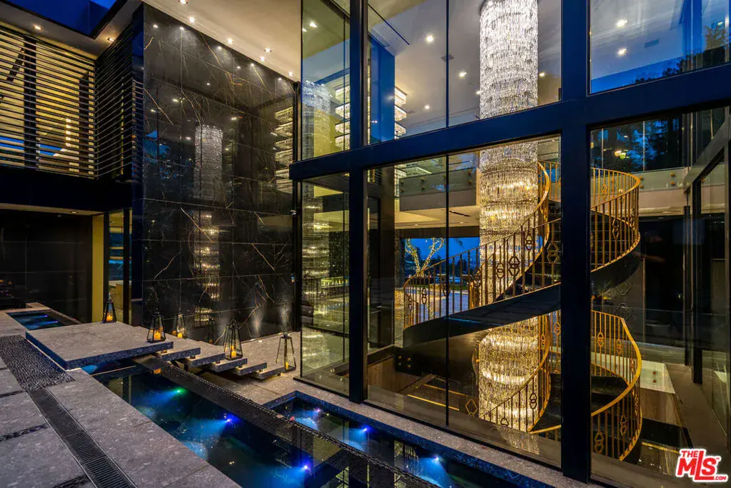 Seller accepts crypto! Experience the pinnacle of lavish splendor and quiet comfort at La Fin, or The End, aptly named as the ultimate, final example of modern decadence and refinement; the be-all and end-all experience in one of the world’s most famous and exclusive enclaves. Sited on a two-acre parcel, this magnificent residence offers 12 spacious bedrooms, 17 bathrooms, remarkable amenities, and brilliant panoramic views of Los Angeles. Just beyond the gated motor court, proceed down to the oversized glass entryway to one of the most beautiful and opulent homes the globe over. A spiral staircase surrounds a stunning 44-foot chandelier made of 55,000 crystals, a showstopping centerpiece yet just one of the impressive custom lighting sculptures throughout the home. The main level features a custom stone bar that flows into the formal living area with a massive hand-carved stone latticework fireplace. All furniture was custom-made for La Fin by Italian luxury brand La Contessina. Motorized Fleetwood pocket doors open to the infinity-edge pool with a striking 23-foot LED screen that rises at the touch of a button and a 30-person lounge area with fire pit. The lower level provides a 6,000-square-foot entertainment area with lofty 18-foot ceilings, custom bar, commercial-grade catering facilities, 1,000-bottle wine cellar, cigar lounge, ice-cold vodka tasting room, and a jaw-dropping automated six-car vehicle elevator display. Additional amenities on the lower level include an outdoor lounge area, luxury fitness center with rock climbing wall, spa, steam room with backlit onyx, massage room, and sound-proof cinema. The second level features a grand primary suite with Italian hand-crafted floor-to-ceiling oak cladding, lounge area, coffee bar, spa-like bathroom with Calacatta Gold marble, massive 100-square-foot shower, solid marble vanity, dual showroom-style walk-in closets, and private wraparound balcony with sweeping views, spa, fire pit, and TV. The rooftop deck offers additional outdoor/entertainment space with built-in seating, fire table, video screen, elevated spa, and even more incredible vistas. Staff residences and a detached guest suite offer ample space. Fingerprint technology and security command center provide the utmost privacy and safety. The meticulously designed and curated La Fin is a once-in-a-lifetime Bel Air estate that can only be admired but never replicated.