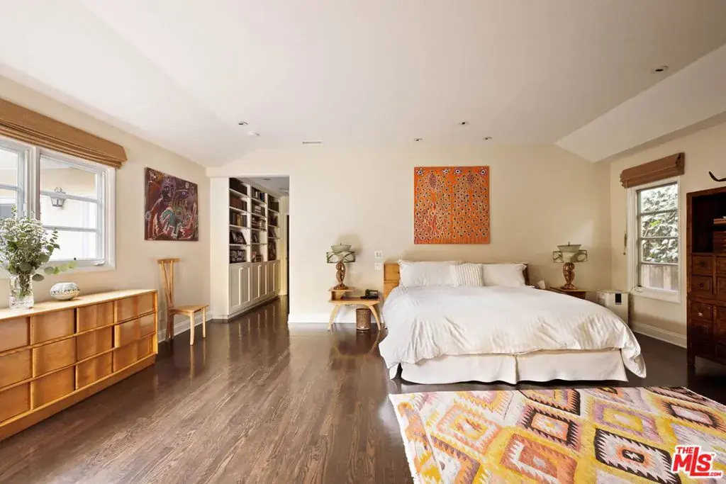 Gated 1948 Traditional-style home with 5 bedrooms and 5 baths on nearly half an acre in a serene, park-like setting in the Lower Bird Streets north of Sunset. Exceptionally private, meticulously maintained, and extensively updated, the property is ideal for year-round indoor/outdoor entertaining. A wraparound porch overlooks the lush, secluded flat front yard. The front door opens to a black-and-white marble foyer and expansive living room with bay window, crown molding, and antique French marble wood-burning fireplace. The formal dining room with wainscoting and pocket doors opens to the family room featuring a second wood-burning fireplace with antique mantel, built-ins, and bookshelves. A breakfast bar and informal dining area flow into the large chef’s kitchen with professional appliances and walk-in pantry. Windows and French doors throughout provide abundant light and backyard views. Off the kitchen is a separate guest or staff suite with ensuite bath and walk-in closet, plus adjacent laundry room. A central hall with powder room leads to the private primary suite with cedar-lined walk-in closet and bath with soaking tub and heated floors. Two additional generously sized bedrooms, one with built-in desk and shelving, share a full bath. The lower level with separate entrance offers flexible use as an office, bedroom, gym, screening room, guest and/or staff quarters, with ensuite bath, plus a temperature-controlled 1,500-bottle wine cellar, and large storage room. The exceptional deep lot is framed by mature trees and gardens and features a large swimmer’s pool, lounge, and outdoor dining areas. Major NEW upgrades include a dual high-efficiency heat pump HVAC system and ducting, flame-retardant/cool roof, 400-amp electrical service, whole-house solar, tankless water heater, pool equipment, dual level 2 EV chargers, and drought-resistant landscaping. Warm, refined, and impressively private, just minutes to studios, dining, shopping, and West Hollywood Elementary.
