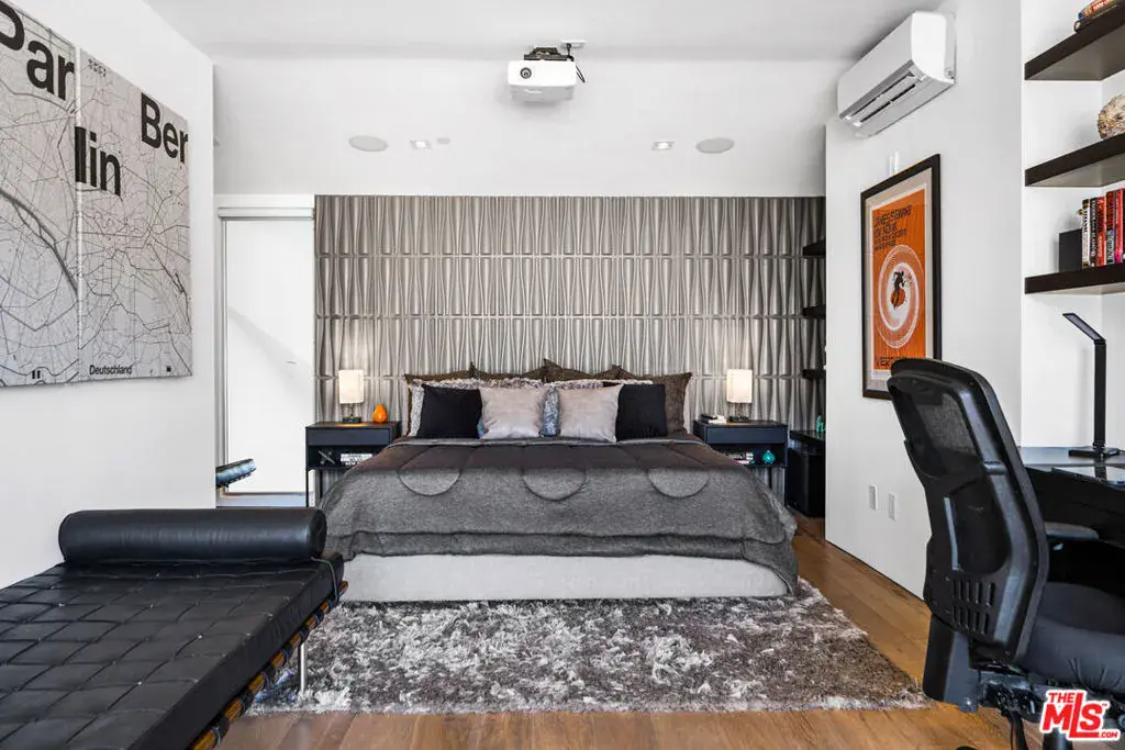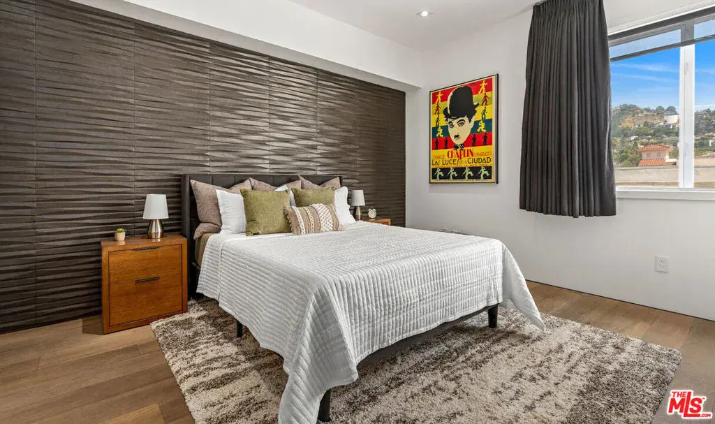 Video tour available of this furnished rental. This furnished, turn-key penthouse is set in one of West Hollywood’s most coveted locations, offering a refined blend of privacy, natural light, and elevated design. South-facing and drenched in sunlight, the expansive living room showcases soaring vaulted ceilings and an open layout ideal for entertaining. The 2-bedroom, 2-bath residence spans approximately 1,800 square feet and is thoughtfully curated with high-end finishes, beautiful lighting, and designer details throughout. The first-floor bedroom features a large walk-in closet and a spa-like en-suite with soaking tub, separate shower, and double vanity, while a discreet hallway pantry provides exceptional hidden storage. Floor-to-ceiling windows in the living area frame sweeping city views and are fitted with custom shades for privacy. The designer kitchen anchors the space with a large island seating four, stainless steel appliances, abundant cabinetry, and comes fully equipped with plates, silverware, and everyday essentials. Upstairs, the private primary retreat offers generous closet space, an en-suite bath, and a built-in desk. The true showstoppers, however, are the in-home movie projector and the private rooftop deck complete with folding floor-to-ceiling glass doors that create seamless indoor-outdoor living. Entertain on the private rooftop while enjoying breathtaking Hollywood Hills views from sunrise to sunset and into the city lights. Additional features in this pet friendly retreat include a private laundry room, side-by-side underground gated parking/EV charger, and a secure building with coded elevator access.