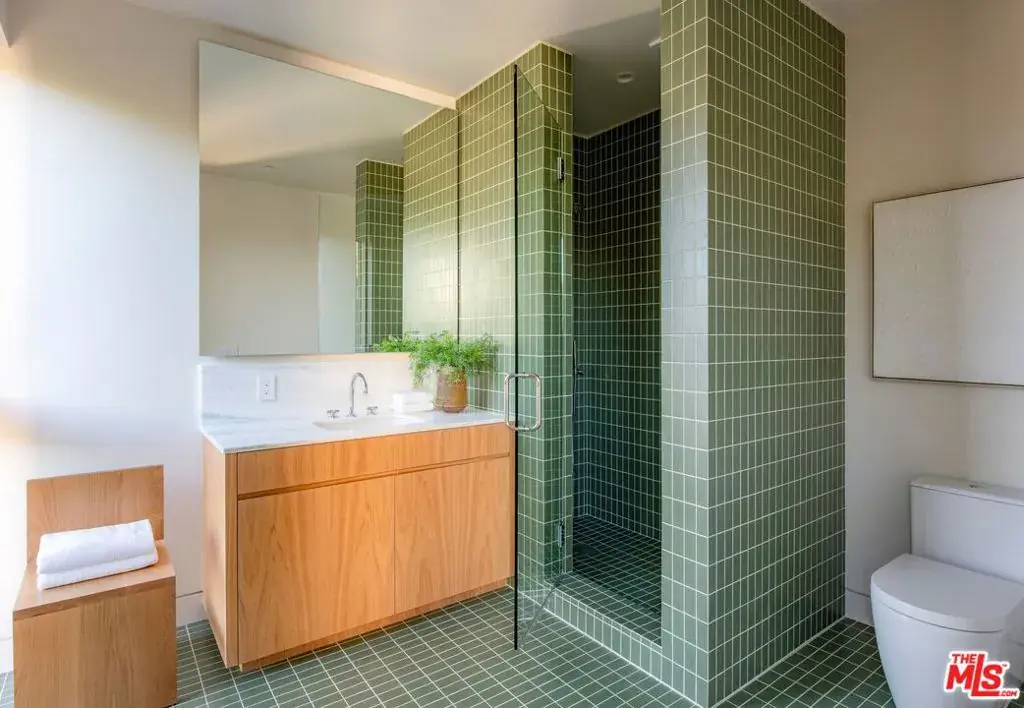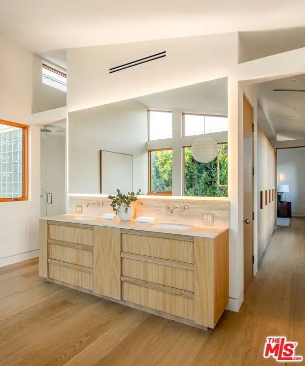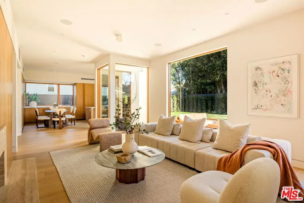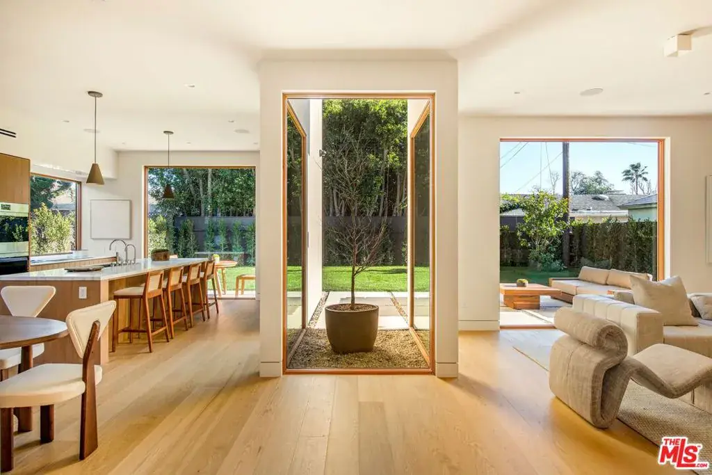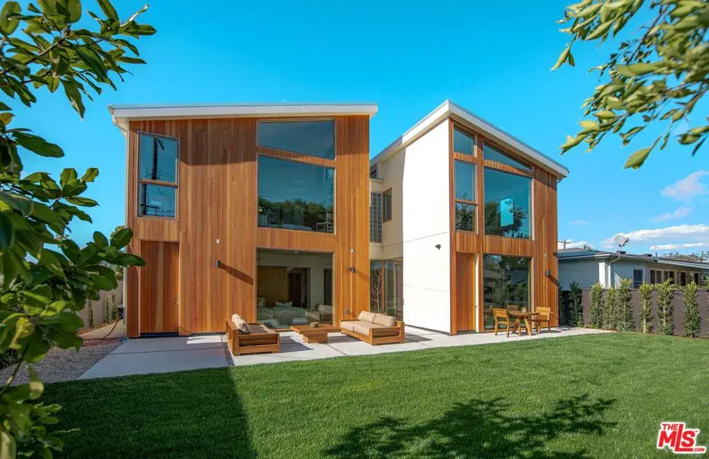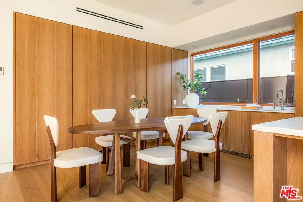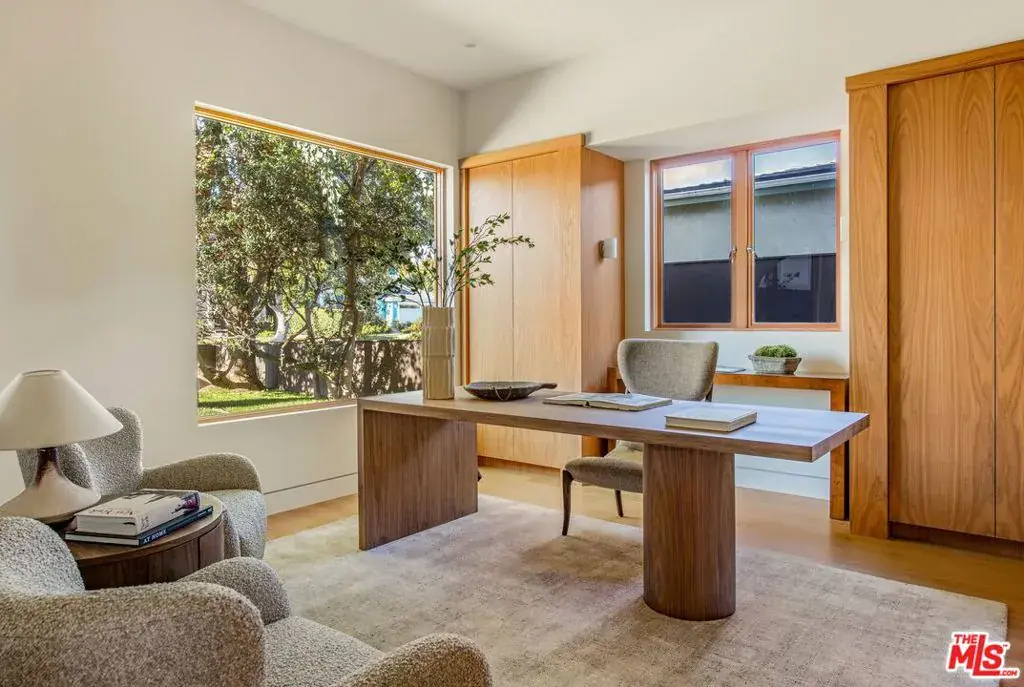A striking, newly constructed architectural residence rooted in wood-forward contemporary design, distinguished by intentional detail and abundant natural light. Developed by Koral Real Estate and designed by architect Dean Levin of 22RE, this 4-bedroom, 4.5-bathroom home spans 3,516 SF of living space on a 5,596 SF lot in prime Mar Vista, highlighted by custom Douglas Fir detailing, a thoughtfully designed open layout, and elevated craftsmanship throughout. Inside, expansive windows flood the interiors with exceptional light, illuminating European-engineered white oak floors and clean-lined finishes that establish a warm, minimalist foundation. The designer kitchen is wrapped in custom white oak cabinetry and Greek Pentelikon honed marble countertops, featuring a Wolf appliance suite with double ovens and cooktop, paneled Thermador refrigeration, dual sinks, beverage refrigerator, and a generous island designed for gathering. The kitchen flows seamlessly into the spacious great room anchored by a travertine mantel with an EcoSmart fireplace, complemented by a dedicated dining area that feels both connected and distinct. Oversized windows overlook the private backyard retreat with patio, lawn, mature hedging, and a serene atrium, with two thoughtfully positioned doors offering convenient outdoor access. The main level also offers a dedicated office with adjacent full bath and a statement powder room. Upstairs, all bedrooms are en-suite, including the primary suite with soaring slanted ceilings. A pair of separate dressing corridors, each with built-in storage, lead to the spa-inspired bath featuring dual vanities, soaking tub, and a custom block glass walk-in shower. The exterior boasts a distinctive architectural presence defined by vertical-grain Douglas Fir siding, custom detailing, mature olive trees, and a private driveway with a two-car garage. This meticulously crafted new construction offers refined modern living on a desirable tree-lined street in the heart of Mar Vista, moments from top dining, shopping, and schools.