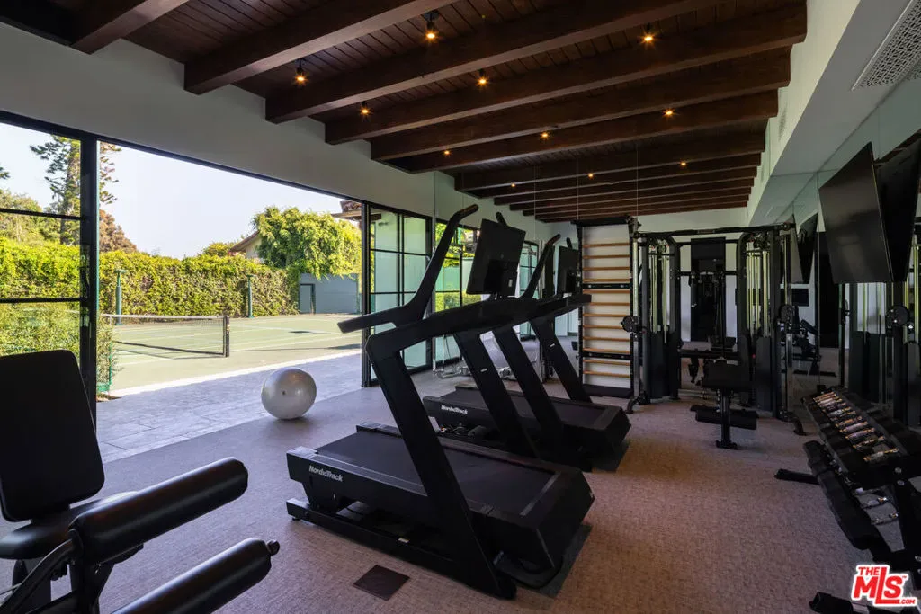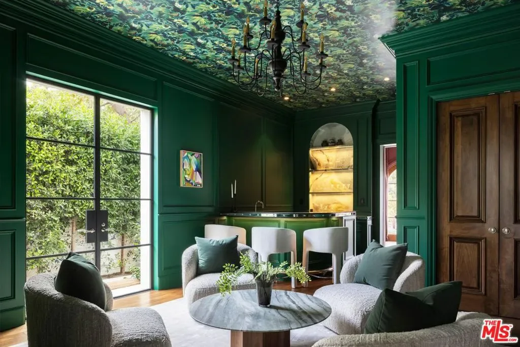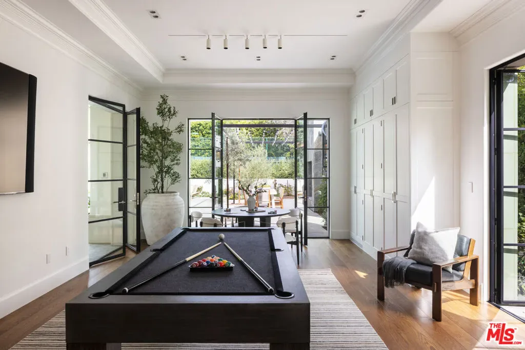 Behind the gates of a private cobblestone motor court in the heart of Brentwood Park stands The House of Hanover. Timeless European architecture reimagined through a contemporary lens this is the result of a three-year collaboration between AY Architects, Rattigan Construction, and Coppel Design. Spanning nearly 12,000 square feet entirely above grade, the residence reflects uncompromising craftsmanship at every turn. Dramatic ceiling heights and voluminous interiors unfold through a sequence of elegant spaces framed by arched passages, wide-plank wood floors, and black steel windows and doors accented with Nanz New York hardware. The Italian chef’s kitchen crafted by Officine Gullo Firenze is a statement in precision and beauty, showcasing hand-finished stainless steel cabinetry, an eight-burner range, and Gaggenau dual ovens and refrigeration. Formal and informal living rooms, a pub lounge, game room, library and dining salon together create a seamless flow ideal for both grand entertaining and intimate living. Upstairs, five generous en suite bedrooms reveal an artful interplay of pattern and stone, featuring House of Hackney wall coverings and exquisite natural marbles. The primary suite is a private sanctuary with dual baths clad in Norwegian Rose marble and dual custom walk-in dressing rooms, each designed with couture-level detail. Beyond the main residence, the grounds evoke a private resort with a resort-sized pool with a Badu swim jet, lighted tennis court and a spectacular entertainer’s pavilion complete with raised-beam ceilings and a commercial sized bar. Additional amenities include a detached professional gym with a full bathroom, state-of-the-art theater with a powder room, pool changing room with a 3/4 bathroom and an outdoor shower, and a full outdoor kitchen with a bbq and a pizza oven. The over sized three-car garage is lined with built-in storage. Throughout, every fixture and finish tells a story of connoisseurship: lighting by Paul Ferrante, Mechini, I Borbone and Murano chandeliers, plumbing by Sherle Wagner and THG, Crestron home automation for seamless comfort and effortless lifestyle. There is a solar system, Two Tesla car chargers, a Tesla battery generator plus a backup gas generator. The House of Hanover represents the rarest form of Los Angeles luxury, a one-of-one estate of timeless character and contemporary grace.
