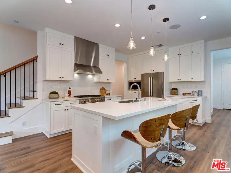 Brand-new 2023 masterpiece crafted by Thomas James Homes, this new-construction Spanish Contemporary townhome spans two stories and offers four spacious bedrooms and 2.5 tastefully appointed baths.Prepare culinary delights in the chef-inspired kitchen, complete with a walk-in pantry, a generously sized center island with bar seating, and top-of-the-line new stainless steel appliances, including a Bertazzoni gas range and Frigidaire refrigerator, dishwasher, and microwave. The adjacent dining area provides an inviting space for entertaining, highlighted by a chic decorative light fixture that adds a refined touch of sophistication.Throughout the home, wide-plank vinyl flooring, recessed lighting, white shaker cabinetry, white quartz countertops, and polished chrome plumbing create a clean, contemporary aesthetic.On the upper level, three well-appointed secondary bedrooms are thoughtfully designed to accommodate the needs of a modern lifestyle. A bath with a dual-sink vanity and tub-shower combination serves these bedrooms, while linen cabinetry and hallway shelving provide convenient storage. A dedicated laundry closet with side-by-side washer and dryer enhances everyday functionality.Retreat to the luxurious grand suitea true haven of tranquilityfeaturing a sumptuous bath with dual-sink vanity, a walk-in shower with a comfortable seat, and an expansive walk-in closet designed to meet all your storage desires.Step out to a private, grassy backyard and BBQ area, perfect for outdoor enjoyment. Additional highlights include a private two-car garage with direct private entrance and extra parking in the driveway.Situated in a prime location, this home offers exceptional convenience with quick access to Beverly Hills, West Hollywood, and major freeways. Immerse yourself in the epitome of modern living, where thoughtful design, contemporary elegance, and urban accessibility seamlessly come together in one exceptional offering.