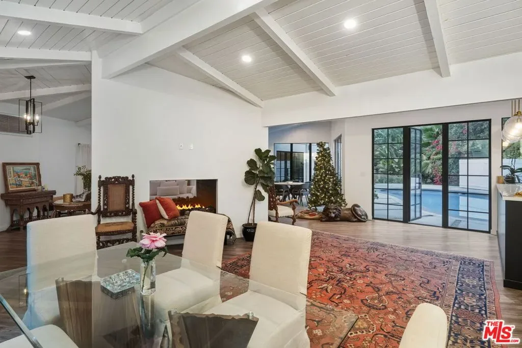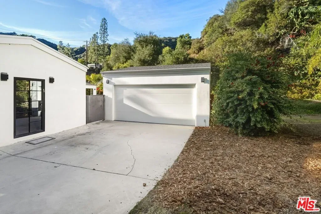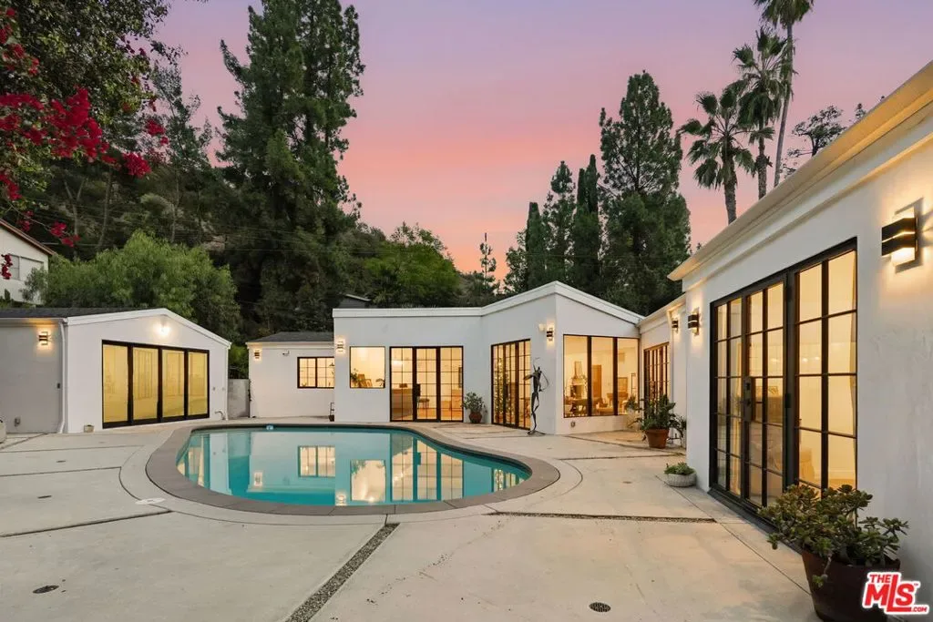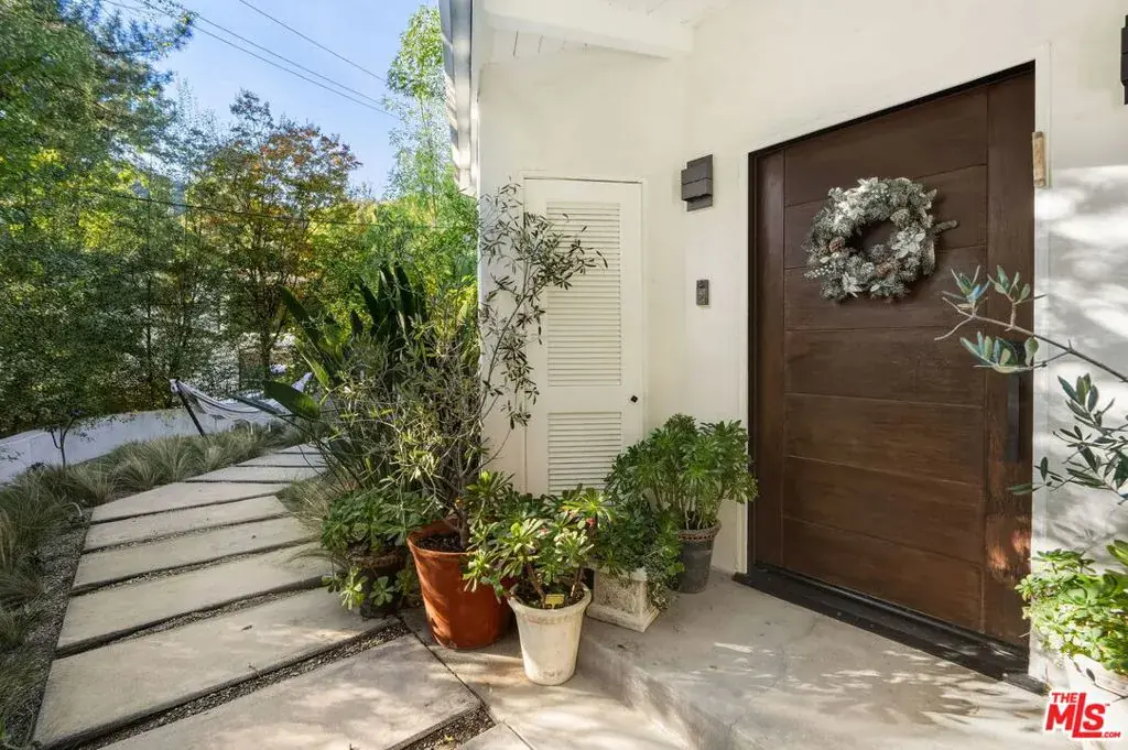 Striking Mid-Century Haven with Expansive Pool, Privacy & Canyon Views. Tucked behind a gated entrance off Upper Mandeville Canyon Road, this striking mid-century residence sits on a lush 12,455-square-foot lot dotted with mature myrtle and pepper trees. Thoughtfully expanded and remodeled, the 2,888 sqft architectural home blends timeless design with dramatic natural surroundings. Inside, ash veneer floors, pitched beam ceilings, skylights, and custom steel-framed windows and doors create a seamless indoor-outdoor experience, reflecting the expansive pool, patios, and serene canyon vistas beyond. The open living, dining, and family spaces offer warmth, flow, and abundant natural light, anchored by a luminous formal entry and double-sided fireplace. The chef’s kitchen is a showstopper, wrapped in wide picture windows framing verdant nature and outfitted with stainless steel appliances, a center island, quartz countertops, and generous pantry storage. Ideal for entertaining, the layout connects effortlessly to both interior gathering areas and the outdoor oasis. A private bedroom wing features two guest bedrooms and a beautifully appointed shared bath with double vanity and custom tilework. The luxurious primary suite is a tranquil retreat, boasting clerestory windows, a spa-inspired bath with a freestanding tub and open shower, an oversized walk-in closet, and French steel doors that open directly to the pool. Additional highlights include an oversized two-car garage with 420 sqft of flexible utility space or studio potential, serpentine pavers surrounding the home, and a rare sense of serenity just moments from Brentwood’s coveted dining/shopping scene.