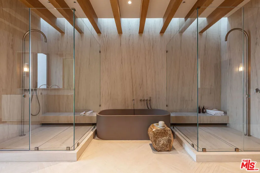 Welcome to “Five Fathoms” the latest creation by celebrity designer Jae Omar and architect Eran Gispan. A residence of timeless beauty and organic architecture, it is set on a nearly 21,000 square foot lot. This 9,800 square foot residence unfolds across five distinct structures, thoughtfully connected by glass-encased walkways that “float” over meandering waterways. The interior aesthetic showcases Omar’s signature “organic modern” approach, featuring a textural symphony of sandblasted stone, vanishing walls of glass, and meticulously crafted white oak accents that converge in perfect harmony. The primary suite stands as a singular retreat, complete with a private library, a vast deck, and an ethereal, stone-wrapped bathroom that is cloaked in natural light from strategic skylights that continue into the custom walk-in closets. Additional features include an ADU conceived as a serene wellness retreat, a 65-foot swimming pool adorned with a grand spa and cold plunge, expansive cobblestone terraces, multiple outdoor fireplaces, a fully equipped alfresco kitchen, a state-of-the-art Dolby theatre, and a cutting-edge security system with voice-activated infrared technology. A legacy of contemporary design and luxury living. Dream big, live bigger at “Five Fathoms.”