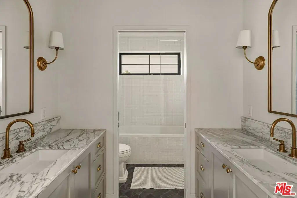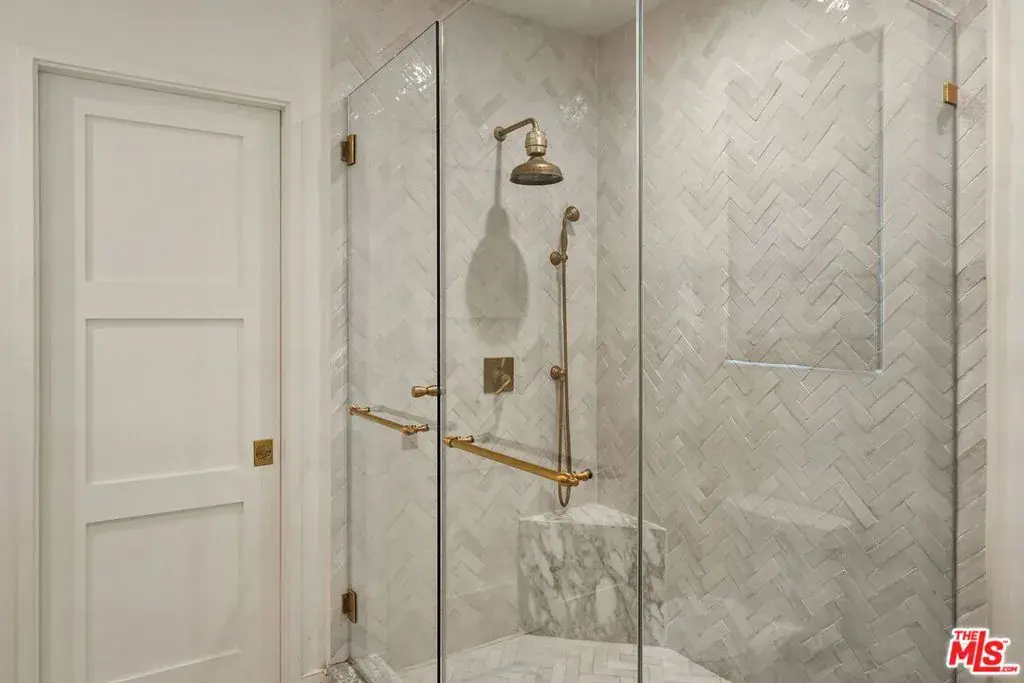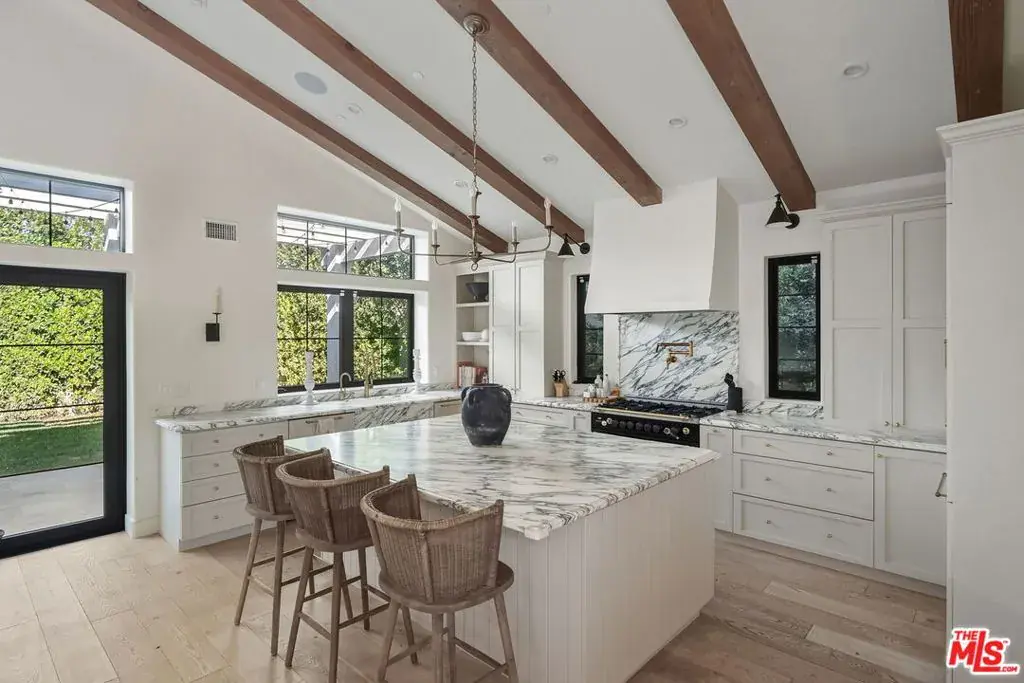 Nestled in Brentwood, this Spanish-style residence evokes timeless sophistication — an architectural gem with interiors worthy of the pages of a design magazine. Classic rustic charm meets modern refinement throughout, with soaring beamed ceilings, wide plank oak floors, graceful archways, and an abundance of natural light streaming through oversized windows. A dramatic double-height entry sets the tone, opening to an expansive great room crowned with beams and framed by a wall of French doors that invite effortless indoor-outdoor living. Carefully curated lighting and integrated surround sound create an inviting ambiance to elevate every moment. The space flows seamlessly from the living area, anchored by a striking floor-to-ceiling fireplace, to a dining nook with built-in banquet seating and onward to the showpiece kitchen. The gourmet kitchen is as beautiful as it is functional, featuring natural stone surfaces, custom cabinetry, and gleaming brass fixtures that feel like jewelry. A substantial center island with bar seating serves as the heart of the home, while a premium ILVE double oven range with a custom hood brings culinary ambitions to life. Just down the hall, a versatile den offers possibilities for a variety of lifestyles, ideal for use as a home office, media lounge, gym, or playroom. The main-level primary suite is a serene retreat, opening through French doors to the lush backyard. Indulge in a spa-inspired en suite bath with dual stone-topped vanities, a glass-enclosed tiled shower, and a generous walk-in closet with custom organization. Upstairs, three spacious secondary bedrooms await, including two with private balconies. A beautifully appointed shared bath features dual vanities and a shower-tub combination. Outside, the fenced backyard lives like a private oasis, enclosed by mature hedging and offering a grass lawn alongside an expansive pergola-shaded patio for lounging, dining al fresco, or enjoying game-day gatherings. Additional highlights include a stylish powder room, a fully outfitted laundry room, and an attached two-car garage with direct home access. Supremely located with convenient access to the best of Brentwood’s amenities and top-rated schools. Popular boutiques and renowned restaurants are just moments away in Brentwood Village and along San Vicente Blvd, while the beach is just a few minutes’ drive. This exceptional residence embodies the romance of the Spanish-style with the ease of modern luxury in one of the Westside’s most desirable neighborhoods.