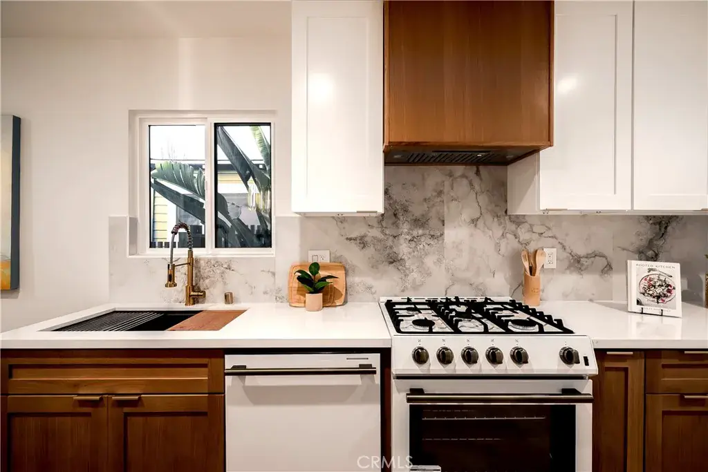 Inside, every inch has been intentionally transformed. Wide-plank floors ground the space. A European-inspired kitchen anchors the home with clean lines, modern cabinetry, quartz countertops, and professional-grade stainless appliances. The open living, dining, and kitchen layout feels social but not loud. It’s the kind of space that works just as well for a quiet weeknight meal as it does for hosting friends over natural wine and good conversation.