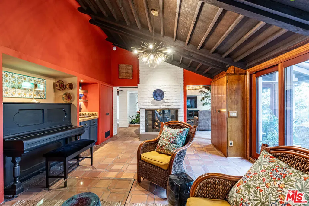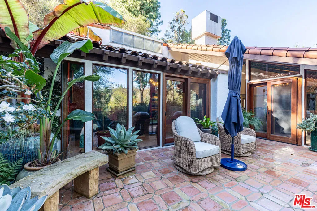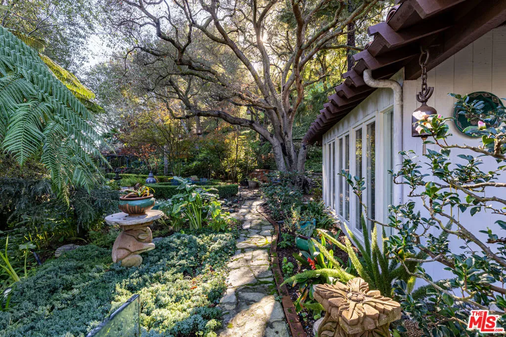 Storybook architectural gem privately tucked away on a sprawling 1.16-acre lot in the Mandeville Canyon enclave. Ideally located at the end of a cul-de-sac, a winding driveway with ample space for parking leads to this three-bedroom, three-and-a-half-bathroom hillside retreat built by Matthew Lieser. Wall-to-wall glass windows on either side of the front entrance blur the line between indoors and outdoors, accompanied by built-in planter boxes and wood-beamed ceilings that encompass organic tranquility. White brick columns flow from the formal dining room into the sun-filled living room, courtesy of charming skylights and sliding doors. A cozy dual-sided fireplace adjoins the den for seamless entertaining. The chef’s kitchen features a generous island, dual ovens, and a floral-adorned hood. The quaint breakfast nook thoughtfully includes access to the expansive exterior patio, perfect for dining al fresco. The primary suite captures stunning canyon views and offers a luxurious stone-lined ensuite with a doorless rainfall shower. Lush, verdant landscaping marked by winding pathways exudes serenity throughout the park-like grounds, all while being minutes away from dining and shops in Brentwood.