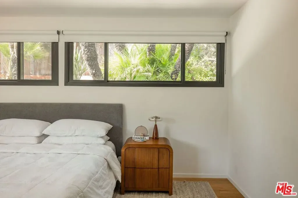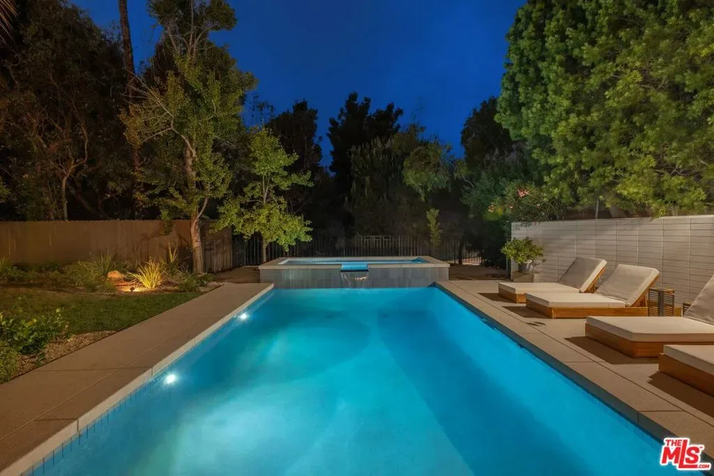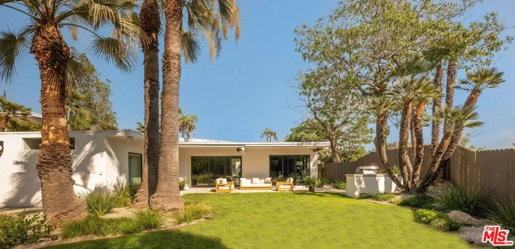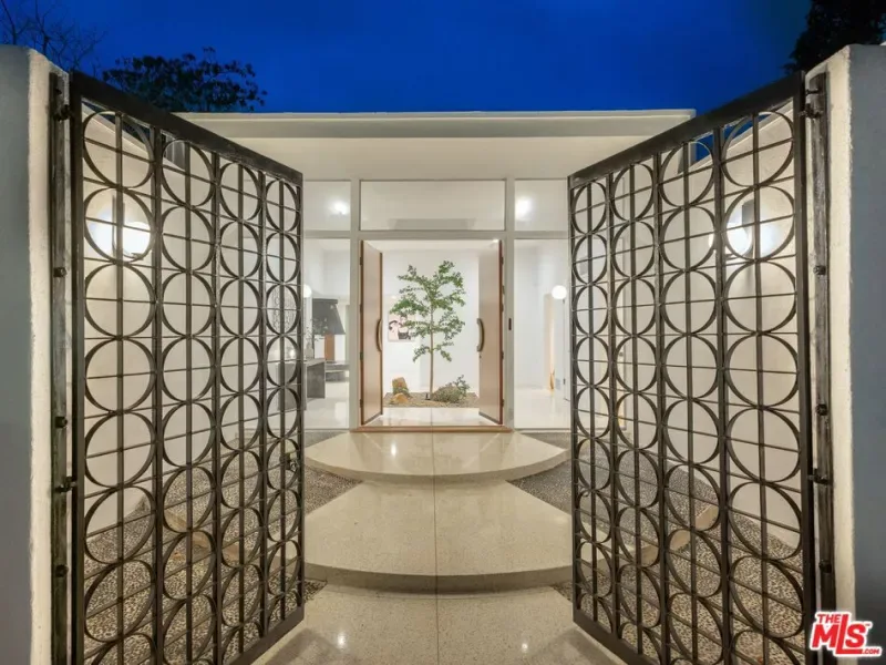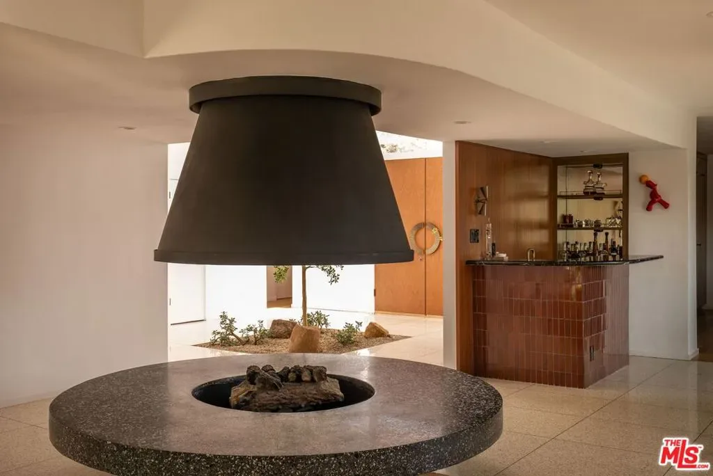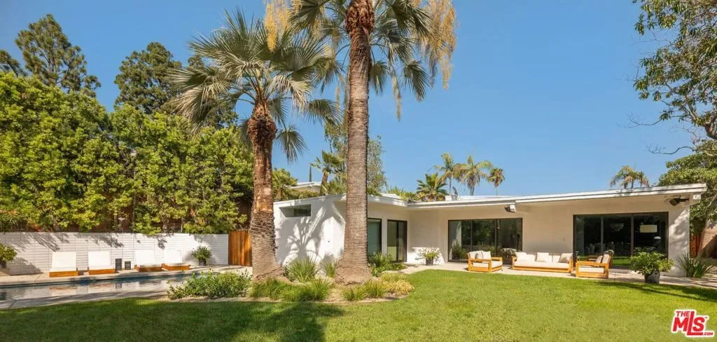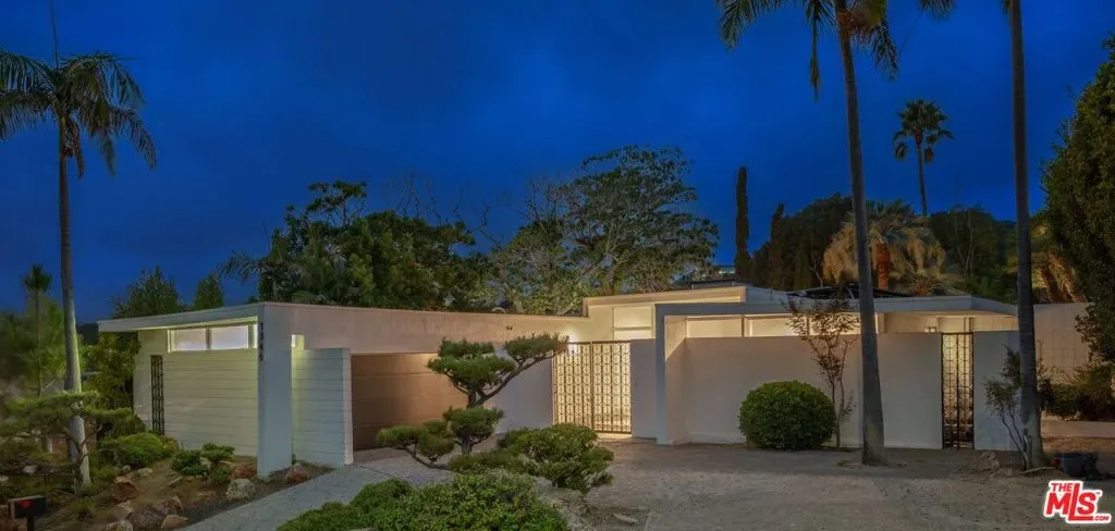 A CLASSIC LA TURN-KEY MID-CENTURY, RIVALING THE TIMELESS APPEAL OF THE ICONIC CASE STUDY HOMES. Set on an expansive three-quarter-acre west-facing lot, the single-story residence seamlessly marries breathtaking canyon views with an effortless indoor-outdoor lifestyle. The home has been thoughtfully reimagined for contemporary living while preserving its authentic mid-century soul. Original brass-bordered terrazzo floors and rich herringbone hardwood create a foundation of timeless elegance, while expansive walls of glass bathe the interiors in natural light and frame serene canyon vistas. A dramatic skylight adds another layer of illumination, and the iconic round black terrazzo fireplace serves as a striking focal point that anchors the living space. Spanning approximately 3,100 square feet, the residence offers four bedrooms and three-and-a-half bathrooms, complemented by thoughtful entertaining spaces. The spacious primary suite features a walk-in closet and a luxurious bathroom with a steam shower, creating a true spa-like retreat. The dining area includes a sleek wet bar perfect for hosting, while the family room showcases custom built-in cabinetry that seamlessly blends form and function. A dedicated game room and spacious mudroom/laundry complete the interior layout. The outdoor spaces are equally impressive, featuring a resort-style pool and spa, professional BBQ area, and expansive flat grassy yard – all designed for both intimate gatherings and grand-scale entertaining. A two-car garage with direct access and a circular motor court with ample parking. This is a rare, turnkey offering in prime Bel Air – an architectural gem where classic mid-century design meets modern luxury in a truly exceptional canyon setting.