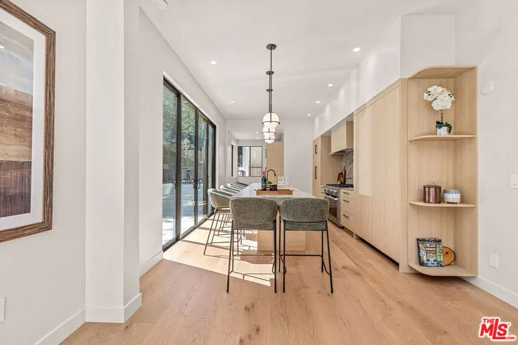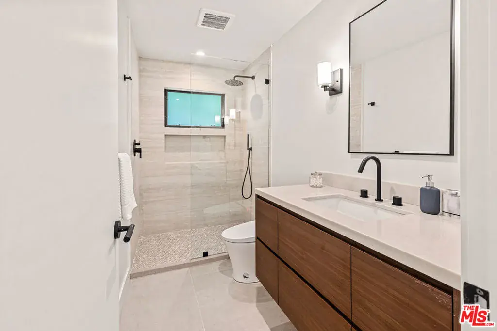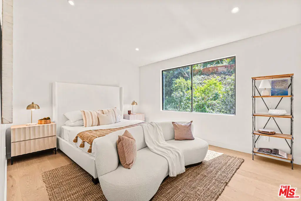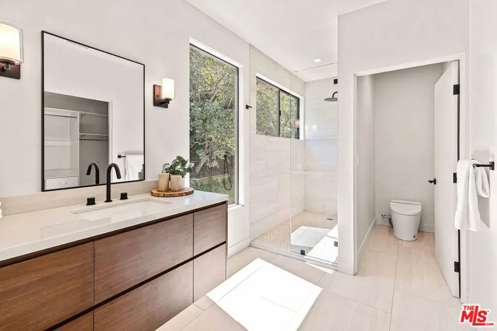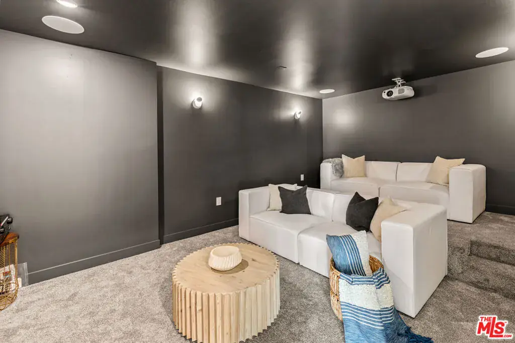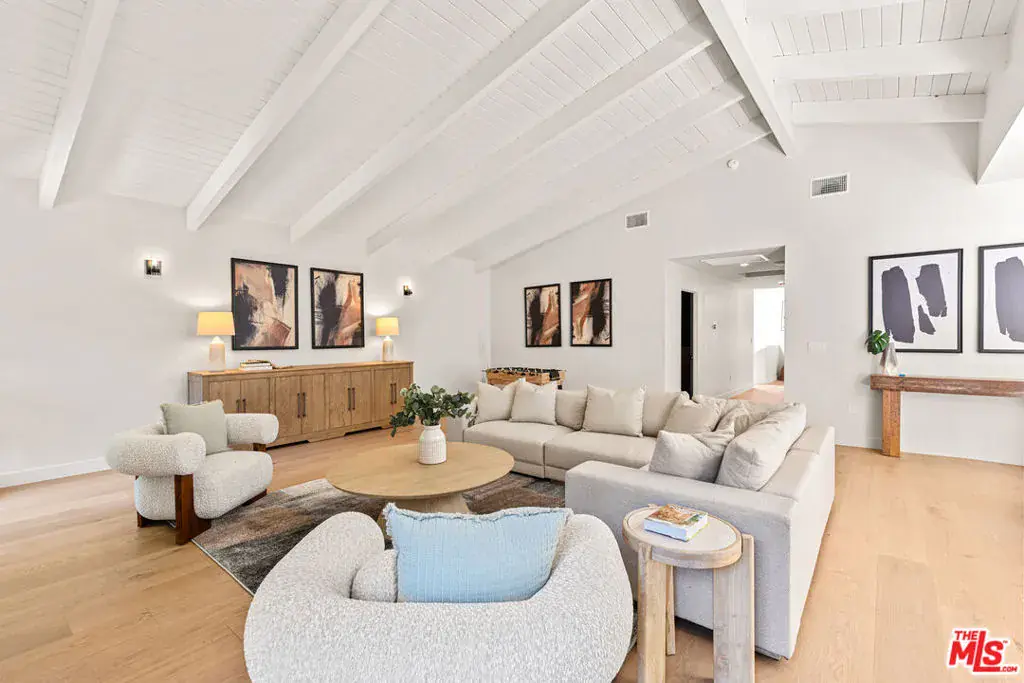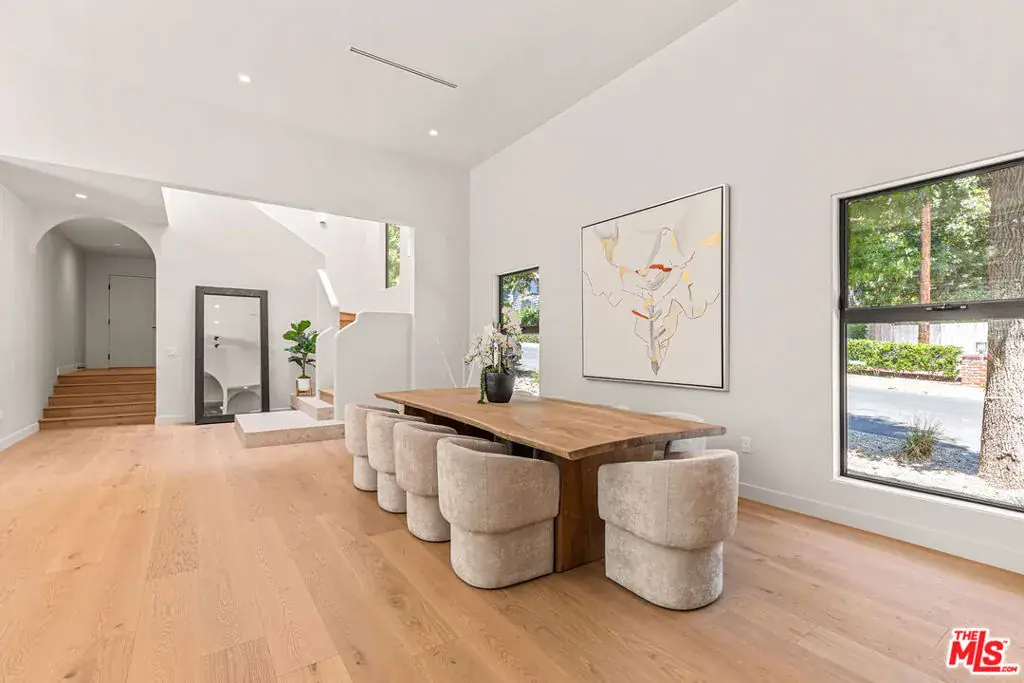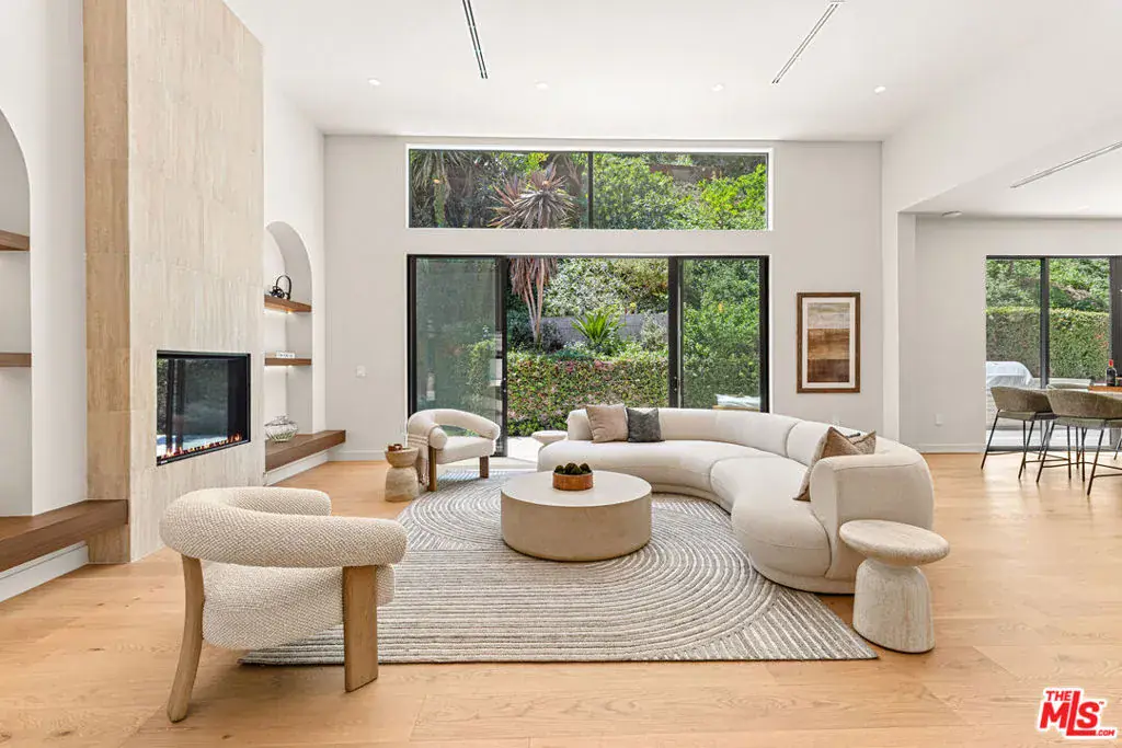 Tucked away on a peaceful street in one of Brentwood’s most coveted enclaves, this strikingly updated 4-bedroom, 6-bath modern residence offers refined design, impressive scale, and effortless livability. A dramatic 10-foot entry door opens to a voluminous interior highlighted by soaring 14-foot ceilings and an expansive, open layout ideal for both everyday living and entertaining. The heart of the home features a chef-caliber kitchen equipped with top-tier appliances, an oversized dining area, and multiple living spaces designed for seamless flow. These areas connect effortlessly to a private backyard retreat, complete with a newly constructed pool and spa, along with dedicated spaces for outdoor dining and relaxation.The primary suite serves as a true sanctuary, boasting a spa-inspired bathroom with dual vanities, a freestanding soaking tub, and a custom walk-in closet. Additional amenities include two thoughtfully placed powder rooms, a newly added theater, and a spacious entertainment lounge with a fireplace perfect for hosting gatherings or enjoying quiet evenings at home. Notable upgrades include a fire-resistant standing-seam metal roof, fully updated electrical and plumbing systems, and a generous three-car garage with ample storage. A rare opportunity to own a turnkey modern home in a premier Brentwood location.