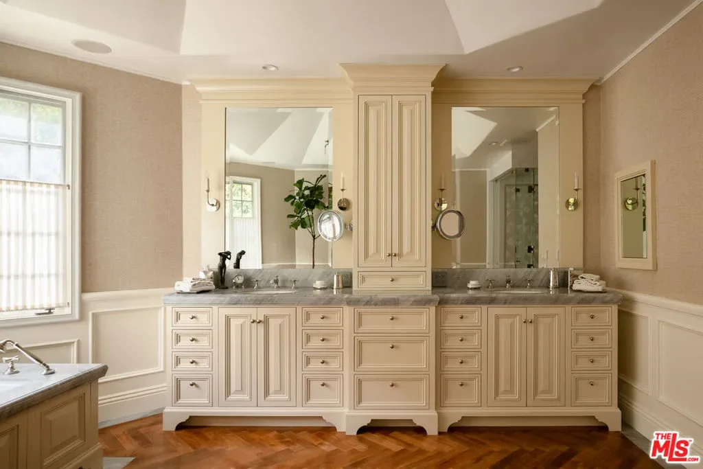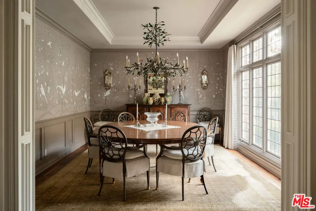 One of the most significant homes within the exclusive gates of Moraga Estates, among just 38 residences in this coveted Bel Air enclave. Discreetly set behind an expansive, tree-lined frontage stretching nearly 600 feet, the stately Tudor residence is surrounded by rolling hillside views, its classic brick facade softened by curated landscaping and a canopy of mature sycamores. Original parquet in the foyer with added custom walnut floors throughout and thick doors with hand-forged hardware anchor the interiors in material richness. The formal dining room is wrapped in hand-painted wallpaper with tall leaded-glass windows lining the room, drawing in soft natural light and framing tranquil views of the surrounding greenery. The chef’s kitchen features Wolf appliances, a farmhouse sink, a large island, and an adjacent pantry includes a second refrigerator, a wine refrigerator, and large-capacity freezer. The kitchen dining area has a concealed pop-up television and access through three French doors that open to a trellised patio with Barbeque area. Nearby, a built-in bar with additional beverage, wine and ice machine. A separate wood-paneled library offers a quiet retreat with a large fireplace, custom built-ins, and an ensuite bath, making it ideal as an office or guest suite. One of the home’s most artful vignettes, the powder room is wrapped in ethereal, painterly wallpaper and grounded by striking black marble flooring. An oval window with a radial grille casts soft, diffused light across the space, illuminating a hand-carved antique vanity and custom marble sink. The primary suite opens to a private terrace with sweeping hillside views often visited by deer. The bathroom evokes the feeling of a treehouse spa with large windows, dual vanities with filtered water, dual toilet closets with Toto Washlets, a seven-foot soaking tub, and a multi-head rain shower. Chevron-patterned walnut and marble floor and ambient lighting add a sense of calm and continuity. Double dressing rooms include custom cabinetry and built-in safes. The guest wing includes three generously sized bedrooms with ensuite baths and walk-in closets. Along the hallway there’s additional storage with three walk-in closets and two linen cabinets. Further down the hallway is a family lounge and a large bonus room that currently serves as a music studio. An additional guest bedroom, walk-in closet and bath is down the backstairs. Outside, a vine-draped pergola runs the full length of the home, strung with twinkle lights and warmed by built-in heaters. The grounds feature a large pool and spa, Swedish sauna, herb garden, firepit with lounge seating, a separate pool bathroom with shower, climbing wall, gymnastics rings, yoga sling, and Rogue stall bars. A fully equipped outdoor kitchen and dining area enhance the experience. The stone driveway leads to a gated portico and an expansive motor court with access to the climate-controlled three-car garage. Security is paramount on Moraga Drive. The community security features 24-hour gated guard service, roving patrol vehicles, and a self-launching drone with infrared technology, making Moraga one of the most advanced residential surveillance systems in the country.