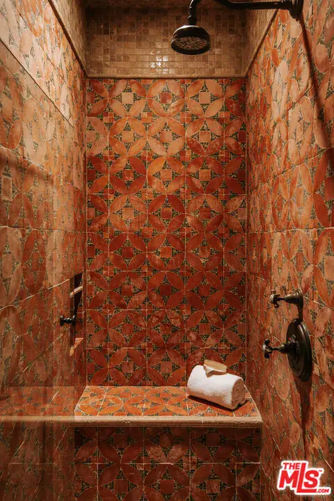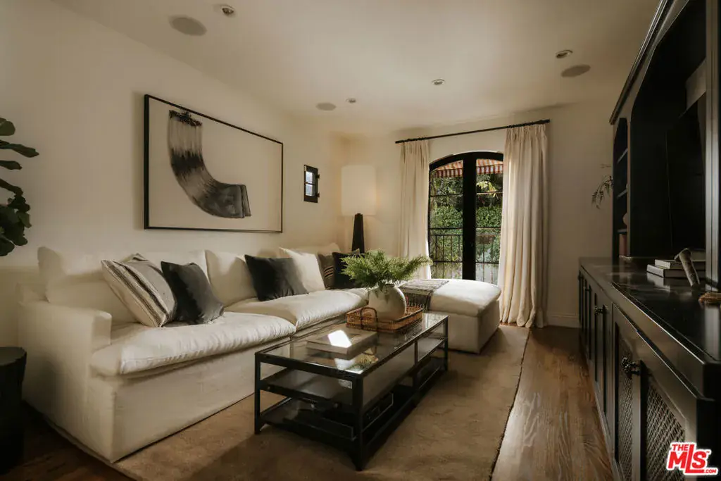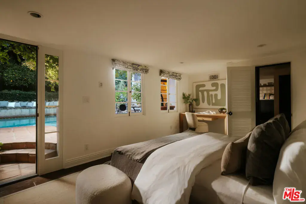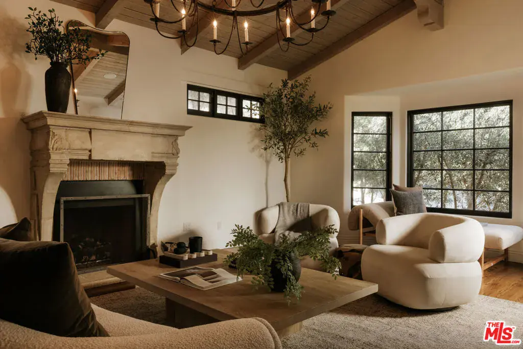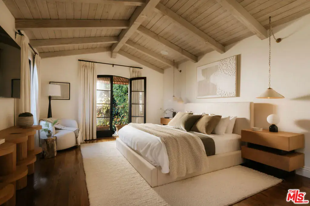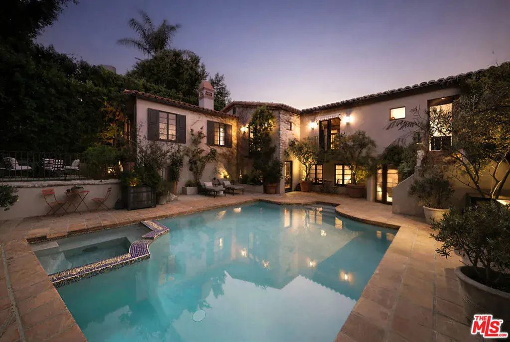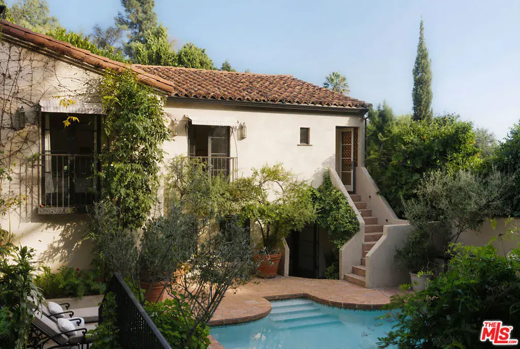 Spanish-style 1930s Hollywood hideaway on lower Queens Road, offering exceptional privacy with celebrity pedigree. Meticulously restored residence with vaulted living room and fireplace, formal dining room, and library/media room with custom cabinetry. Chef’s kitchen features marble countertops, hand-painted tile backsplash, Viking ovens, and Sub-Zero refrigerator. Reading room leads to the primary suite with Juliet balcony, fireplace, and spa-like bathroom. The guest bedroom with its ensuite bathroom, located on the main level, is a quiet haven with garden views. The expansive, flat backyard is perfect for entertaining, featuring a large pool, integrated spa, built-in BBQ, and multiple seating areas. Lush, layered landscaping with citrus, olive, and palm trees creates a serene and private Spanish-inspired oasis. A separate pool-level guesthouse with bedroom, full bath, and kitchen creates an intimate, private hideaway.