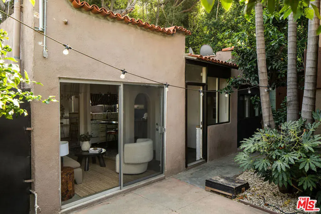 Sunset Square Spanish Hedged + Gated Retreat with lush landscaping, 4 beds + 2 baths in the main house & a 1 bed/1bath back house in the yard. Front courtyard outdoor living room has a stacked tile waterfall flanked by majestic banana trees and surrounded by mature plants. A covered patio and a wide character screened front door takes you into the home. A spacious living room with (decorative) fireplace opens to the dining room, all bathed in sunshine. The kitchen has double sinks, double convection ovens, and a high butcher block island that doubles as a breakfast bar. The kitchen has a stacked washer dryer and it opens to the breakfast room. The 2 bedrooms at the front of the house share a remodeled bathroom off the hallway with a handsome wood double vanity that has 2 sinks and lots of storage & a bath with shower. There are 2 additional true bedrooms at the back of the house – one is an en suite bedroom and the other is currently staged as an office. The house has central HVAC, new copper plumbing, newer water heater, hardwood floors, and a long driveway with tandem four car parking. There’s an outdoor patio at the back of the house with a wood deck + a soaring pitched ceiling overhead + an outdoor fireplace – it offers so much space for both dining and living. On the back property line is a spacious & private one bedroom apartment back house that has a foyer, living room, eat-in kitchen, bedroom and full bathroom. The location is prime, near coffee shops, Trader Joe’s, Bristol Farms, open-air restaurants, and world-class nightlife on Sunset. Lush landscape throughout includes soaring swaying palm trees, fruit trees, ficus trees, and more. Truly feels like a relaxing green compound oasis right in the heart of the city!