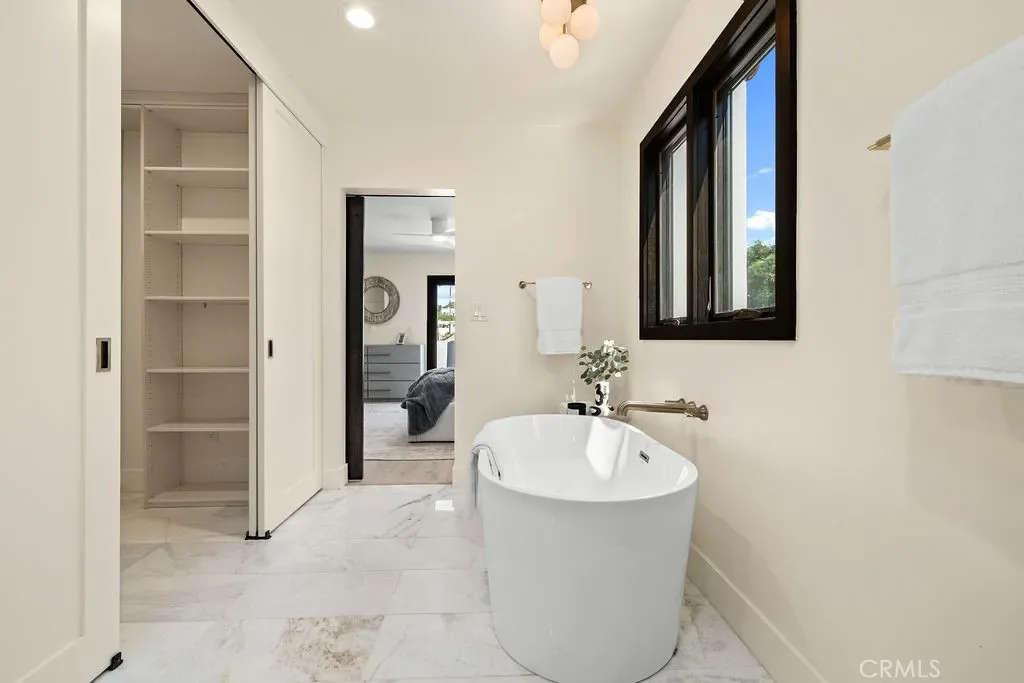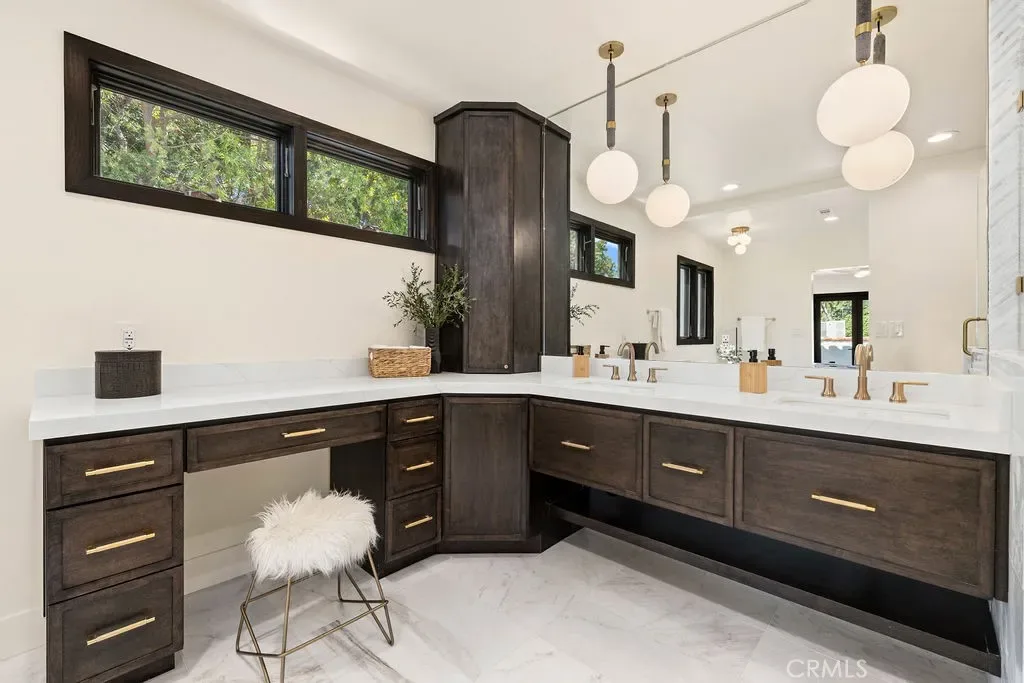 The primary suite evokes a designer spa: Bianco?Dolomite marble floors, Alaska?White herringbone mosaic tile, custom wood cabinetry, and brushed-brass fixtures. Two secondary baths continue the narrative with imported Spanish terracotta fishtail tile, Zellige shower walls, and lava-stone flooring, showcasing craftsmanship and material integrity throughout.