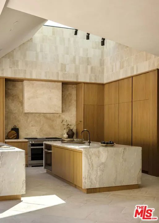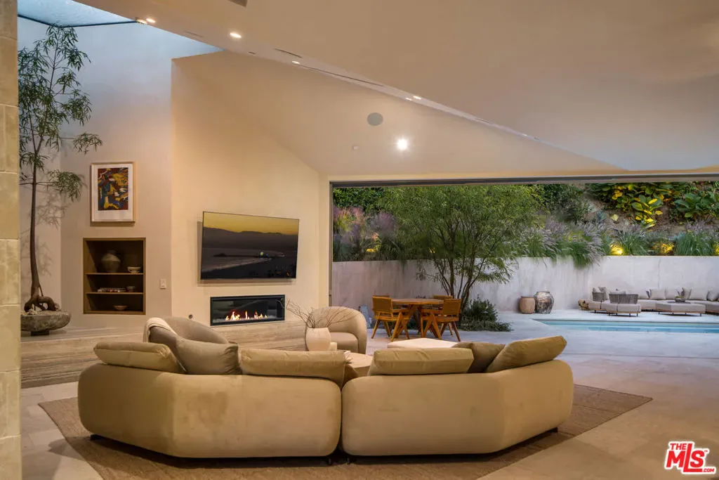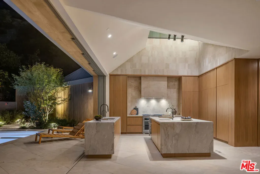 Sculpted Serenity: A timeless design ethos inspired by Amangiri where nature, light, and material exist in perfect harmony. An architectural statement above the Sunset Strip, spanning a single level across 4,600 square feet, where every surface feels sculpted rather than built. Effortless California living through world-class materials. Walls of Moroccan hand-tumbled limestone set a warm, organic tone, complemented by Egyptian limestone floors that flow seamlessly throughout. Custom walnut millwork adds depth and texture, grounding the minimalist aesthetic with natural warmth. The great room unfolds beneath high ceilings that capture shifting light, centered around a Titanium travertine lounge bar a sculptural focal point of the home. Designed for those who value art and beauty, interiors feature expansive art walls with subtle, specialized lighting. The silver-travertine fireplace and powder room bring quiet sophistication, their textures echoing the surrounding landscape. In the kitchen, a travertine hood and bespoke walnut cabinetry reflect refined simplicity and craft. The primary suite is conceived as a world-class spa retreat, with a Gold Dune stone bath, steam shower, and wellness and massage room designed for deep restoration. Each bedroom offers tranquil proportion and a seamless connection to nature. Clad in Accoya wood siding that blends with the hillside, the home feels organically rooted in its environment. A perfectly scaled pool sits in total privacy, framed by mature trees and granite outcroppings a serene retreat where architecture and landscape exist in perfect balance. 4,600 square feet includes garage