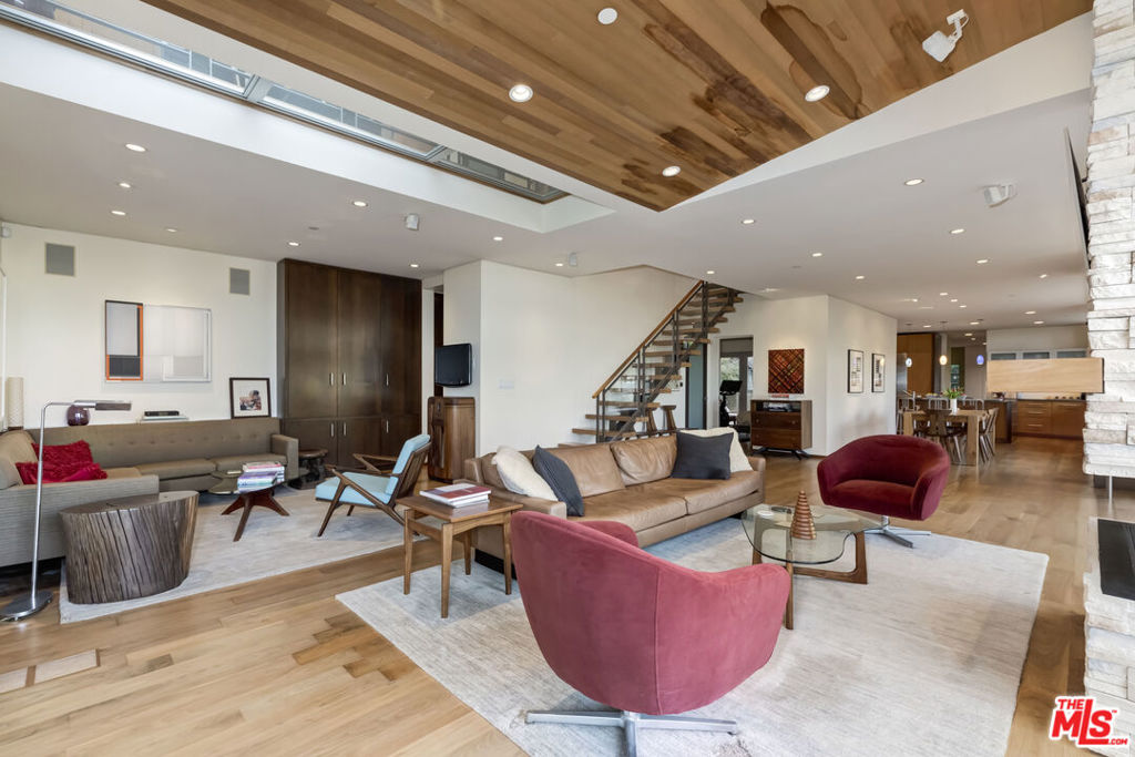 Private and serene with sweeping city views, this gated, custom modernist home in lower Hollywood Hills feels worlds away while remaining exceptionally central to the city. Designed by owner and architect Carter Bravmann, the expansive residence is poised on a terraced site of nearly 10,205 square feet that frames panoramic hill, evening-light and Downtown LA views. Nearly every room in the four-bedroom, four-bath arrangement welcomes city, hill or garden vistas, with a blend of floor-to-ceiling and clerestory windows allowing natural light to bathe living areas in a warm and inviting glow. The free-flowing two-level floor plan of approximately 3,816 square feet offers public spaces for entertaining and relaxation on a virtually seamless first floor, where the living room and den showcase a vaulted wood ceiling and stone fireplace. A built-in window seat enhances the dining room, which continues to a chef-inspired kitchen with custom wood cabinetry, an island with prep sink, granite countertops, high-end stainless-steel appliances, and French doors leading to the backyard. An ensuite bedroom on this level also opens to the backyard, and the versatile family room can be enjoyed as a fourth bedroom with private bath. Upstairs, guests will appreciate a private suite with impressive views and access to an adjacent deck. The primary suite’s two balconies captivate the eye with the iconic views you’d expect in the Hollywood Hills. The main bedroom has a sitting area with fireplace. A barrel ceiling finished with natural wood crowns the space, which also reveals a magnificent walk-in closet with custom built-ins, and a large bath with floating vanity, two sinks, and a walk-in wet room with rain shower and tub. High ceilings continue throughout the second floor, which hosts a convenient home office. Every detail was personally selected by Bravmann, including wood flooring, a floating open-riser staircase, mitered windows for flawless views, recessed art lighting, and natural stone finishes and amenities. Virtually hidden from the street behind a gated driveway with two-car garage, outdoor spaces are embellished by lush landscaping that weaves towering bamboo and manicured vines into a front patio and a gorgeous backyard with pool. Taking its place near such esteemed landmarks as The Stahl/Case Study House 22 and Frank Lloyd Wright’s Storer House, this modern architectural home is easily walkable to all things fun along the Sunset Strip, including shops, restaurants and clubs.