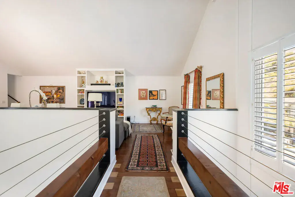 Move-in ready, Modern systems, Gated with two car garage and room for additional cars and Prime access to the Westside. A rare combination at this price point. A serene sanctuary in desirable Beverly Glen. Enter through a lush, private courtyard with mature greenery and a tranquil fountain that sets the tone for this refined, impeccably maintained home. The welcoming foyer, with cedar-lined closet, leads upstairs to a sun-filled living space featuring soaring ceilings, hardwood floors, and double-paned windows with rich wood shutters. The open layout flows effortlessly into a charming dining area and gourmet kitchen, complete with custom cabinetry, hand-finished wood counters, stainless steel appliances, breakfast bar, cozy nook, abundant storage, and in-unit laundry. The main-level primary suite offers calm and comfort with generous closets, custom built-ins, and a spa-inspired bath with soaking tub, glass shower, and Toto fixtures. A striking mezzanine bridge overlooks the living room and brings you to a vaulted great room with media features and French doors leading to a private yard. Jardin-style landscaping, shaded seating, and a peaceful outdoor area creates a true retreat. Two additional bedrooms; one with a balcony, another with dramatic timber ceilings that opens directly to the yard and share a beautifully updated bath with artisan wood finishes. Additional features include a spacious two-car garage with storage, central vacuum, and easy access to Beverly Glen Center’s restaurants, coffee, and amenities. Minutes to both Westside culture and Valley convenience. Note: Drapes, and Dining room & kitchen chandeliers, are excluded.
