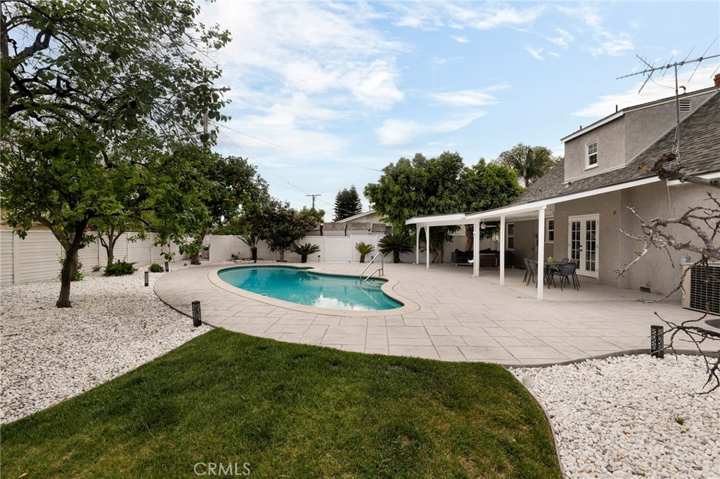 The private backyard is built for true California living, featuring a heated pool, newly installed stamped concrete, and a covered patio—perfect for relaxing or hosting gatherings year-round.