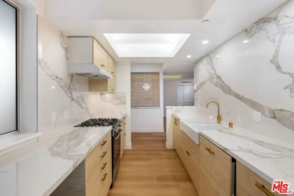 This gorgeous, bright, spacious and completely renovated 2 bedroom, 2 bathroom condominium residence is available for lease now. Entry foyer leads to a large and bright living & dining area with remodeled kitchen offering custom-built cabinetry, designer countertops and appliances. The primary bedroom suite boasts a generous walk in closet & a luxurious spa style bathroom with back lit mirrors and luxurious step-in shower and dual sinks. The 2nd bedroom is located on the opposite side of the main living space, along with a separate 2nd bathroom with an oversized soaking tub and side by side laundry. The unit also offers an enclosed balcony that could be used as a sitting area or office space. The condo includes two side-by-side gated parking spaces, as well as a large storage locker. Building amenities include heated pool, hot tub, gym, sauna, and guest parking. Situated just steps from the Getty Museum, and minutes to Brentwood Village, UCLA, and bike paths, this condo home is also zoned for top-rated Kenter Canyon Elementary, Paul Revere Middle School, and Palisades High School.