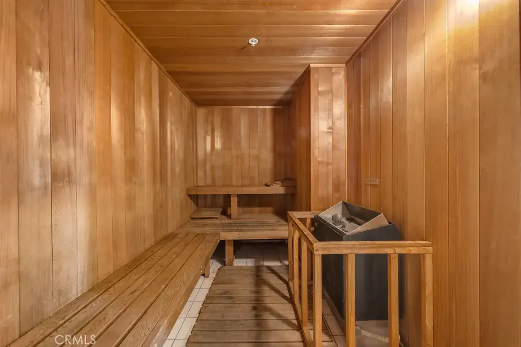 Two assigned parking spaces (#121 and #122) are included, along with additional storage above space #122. Community amenities include a pool, gym, and sauna, within a predominantly owner-occupied building that prioritizes privacy and security.