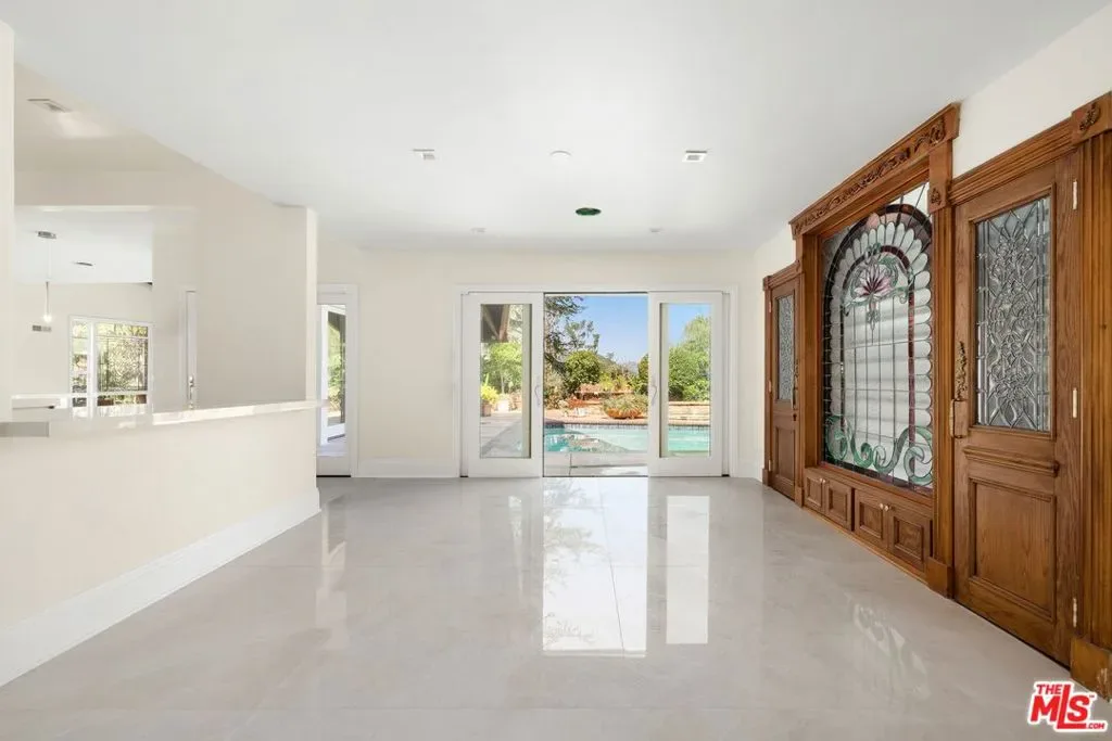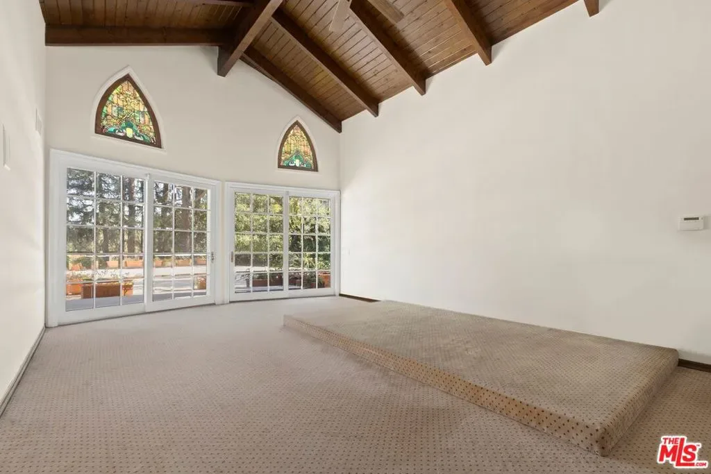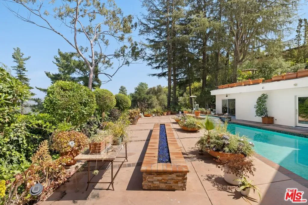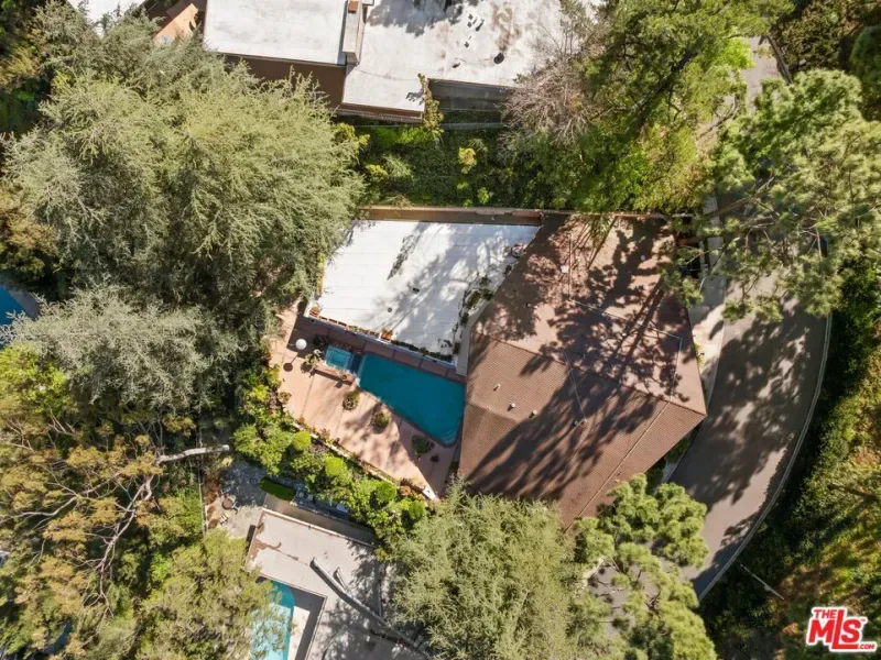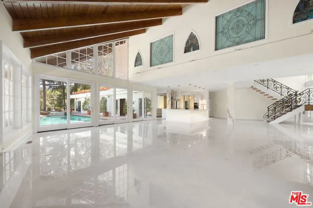 Perched atop prestigious Bel Air with sweeping views over the Stone Canyon Reservoir, this newly reimagined architectural retreat blends timeless design with refined modern luxury. Tucked near the end of a private cul-de-sac, the estate offers exceptional tranquility, privacy, and seamless indoor-outdoor living. A dramatic grand living room with soaring vaulted wood-beamed ceilings, a statement fireplace, and walls of glass opens effortlessly to the expansive grounds, creating an ideal setting for both intimate gatherings and large-scale entertaining. Curated stained glass installation sourced from St. Paul Church introduces a sense of heritage and artistry, casting beautiful natural light and adding a distinctive architectural narrative. The adjacent designer kitchen is a true showpiece, featuring exquisite Italian marble surfaces, custom cabinetry, and a full suite of gold Miele appliances, all anchored by an oversized center island. The formal dining room is elevated by a rare and storied focal point, an original piece from the legendary Chasen’s Restaurant bringing a touch of Hollywood history and timeless glamour to the space as well as throughout the home with additional Chasen’s windows. The upper-level primary suite is a serene sanctuary overlooking the reservoir, complete with a spa-inspired bath offering dual vanities, a sunken soaking tub, separate glass-enclosed shower, and a private sauna. An expansive walk-in closet also ideal as a dressing room or additional flex space completes the suite. Downstairs, four generously sized ensuite bedrooms provide comfort and privacy, complemented by a dedicated office, powder room, and private housekeeper’s quarters. Outdoors, the tranquil grounds evoke a resort-like atmosphere, featuring a sparkling pool, multiple lounge areas, and a dramatic 20+ foot fire pit, an inviting focal point for evening gatherings. A built-in BBQ enhances the outdoor entertaining experience, while a terraced fruit garden just below the main yard offers an array of mature trees, including pomegranate, mango, avocado, and more. A rare offering combining scale, sophistication, and one of Bel Air’s most coveted and peaceful vantage points.