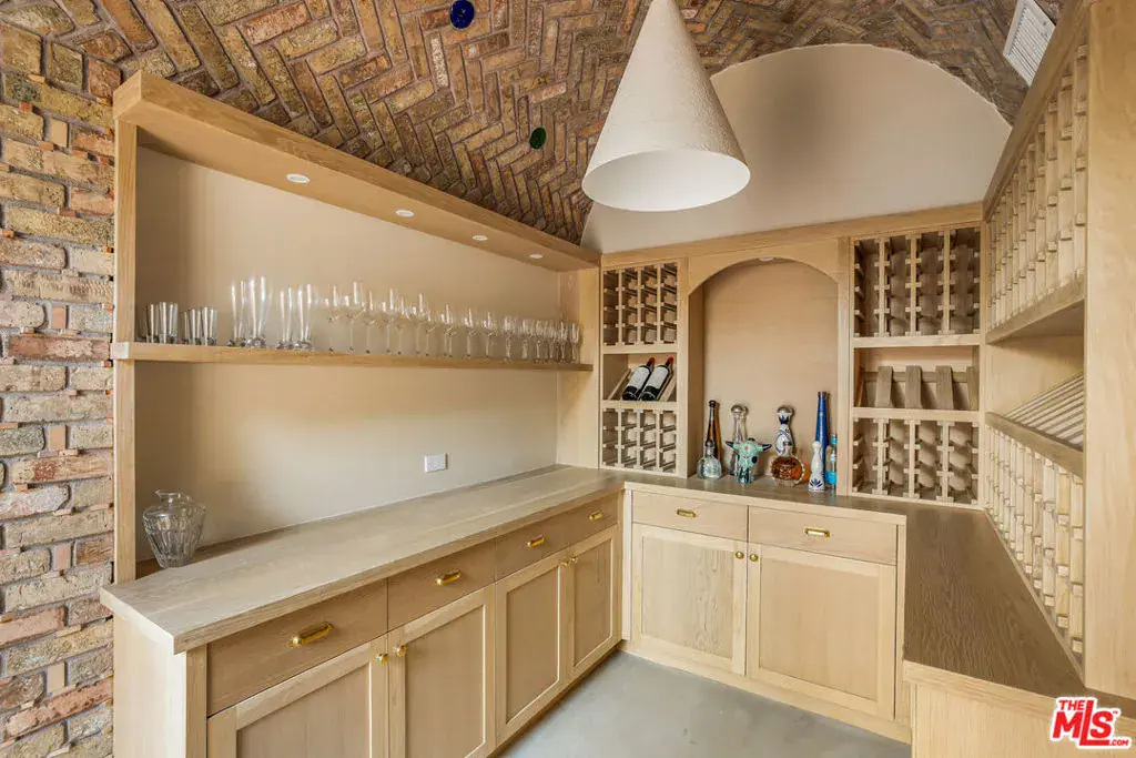 Nestled at the end of a long gated drive in Lower Mandeville Canyon, La Casa De Flores is a Spanish Revival estate of rare provenance and timeless beauty. Designed in 1929 by acclaimed architect John Byers and thoughtfully reimagined for modern living, the home sits on nearly an acre of lush, secluded grounds, offering an atmosphere that feels both grand and deeply inviting. Inside, the craftsmanship of the original era remains intact — with wood-beamed and coffered ceilings, rich hardwood floors, graceful French doors, and hand-crafted casement windows. Sculptural designer lighting fixtures punctuate the interiors, enhancing the interplay of light and texture throughout. The formal living room, framed by garden views, is anchored by a stone fireplace and crowned by thick, solid wood beams. The formal dining room opens to verandas on both sides, creating effortless flow for gatherings, while the warm, inviting family room is wrapped in custom built-ins. The fully remodeled gourmet kitchen blends elegance and function with stone countertops, custom cabinetry, and an expansive dual-surface marble and butcher block island. A Lacanche range sits within a bespoke alcove, complemented by a walk-in pantry. Adjacent, the glass-topped atrium breakfast room dazzles with direct access to the outdoor kitchen and al fresco dining patio outfitted in vibrant Spanish tile and an original fountain. The primary wing offers a serene retreat with a private covered balcony, far-reaching canyon vistas, a corner fireplace, and a designer walk-in dressing room. Its en suite bath, bathed in natural light, features dual marble vanities and a custom-tiled shower. Four additional guest suites, including two joined by a Jack-and-Jill bath, provide comfort and flexibility. A detached office with a tranquil handpainted mural and expansive windows offers an inspiring workspace, while a coved wine cellar adds an indulgent touch. The grounds are a true sanctuary — mature fruit trees, flowering gardens, peaceful fountains, and sweeping lush views frame a 55-foot swimmer’s pool, brick patios, and a pergola lounge with firepit. Accessory structures and a three-car garage complete this rare and private compound, just moments from Brentwood’s finest restaurants, boutiques, and top-rated schools. Blending architectural pedigree with modern comfort, La Casa De Flores is not merely a home — it’s a priceless work of art in one of Los Angeles’ most coveted neighborhoods.