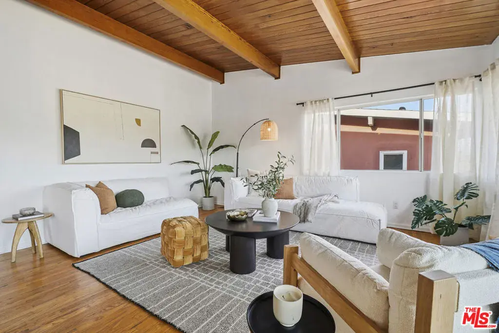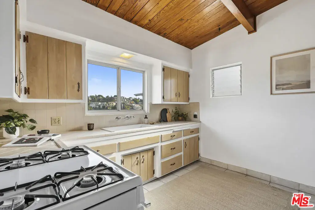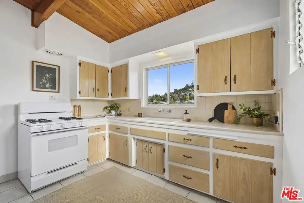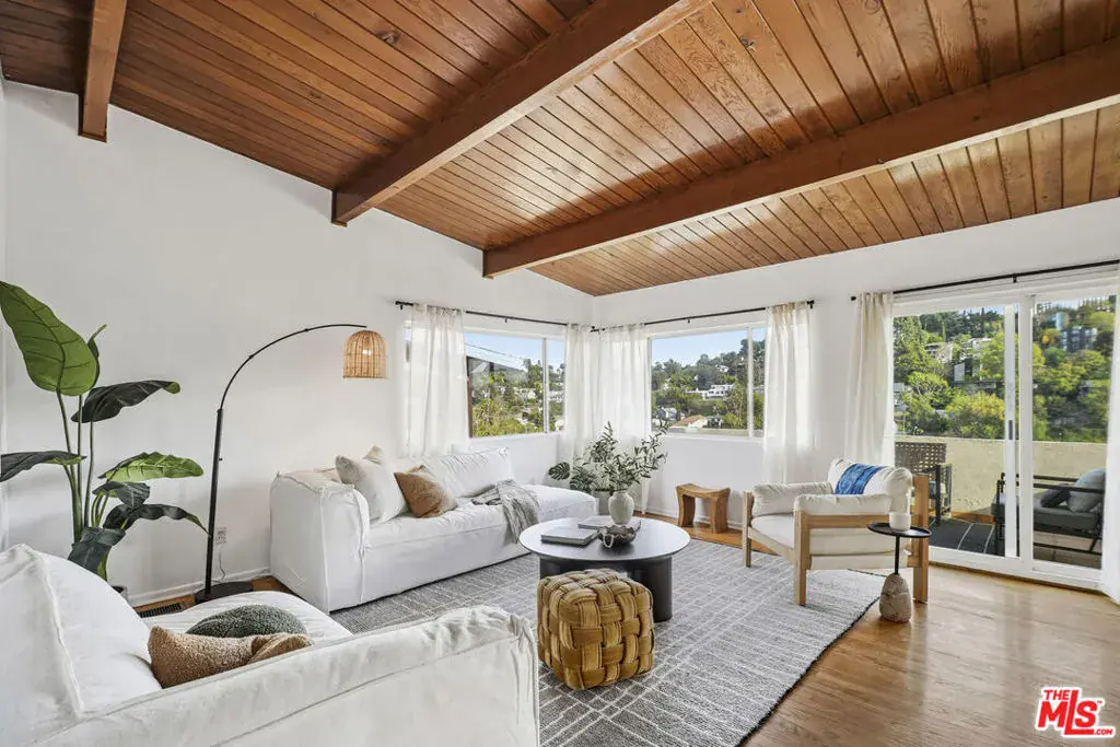 Set above the hillside with wide-reaching views across the Silver Lake Reservoir, Downtown Los Angeles, and the surrounding hills, 1748 Redesdale Avenue offers a classic mid-century bungalow arranged on a single level in one of the neighborhood’s most established pockets.Hardwood floors and distinctive, vaulted wood-clad ceilings define the interior, giving the main living spaces warmth and architectural presence. Large windows line the living and dining rooms, drawing in natural light and framing the evolving city-and-hillside outlook throughout the day. The kitchen sits comfortably within the flow of the home, maintaining its original character while sharing in the views beyond.Two bedrooms are positioned for privacy, offering a simple, well-proportioned layout with a calm, understated feel. Original built-ins and period details remain intact, reinforcing the home’s mid-century identity. Sliding doors extend the living space to a generous balcony, creating an easy connection to the outdoors and a natural place to take in the surrounding landscape.A basement area with plumbing adds flexibility, alongside a one-car garage and a street-to-street lot that opens the door to future possibilities. The home sits moments from the Silver Lake Reservoir, LAMILL Coffee, L&E Oyster Bar, and the collection of shops and restaurants that define Silver Lake, while still feeling removed from the busier thoroughfares.With its views, architectural character, and long off-market history, this is a home that stands apart in the Silver Lake hillside.