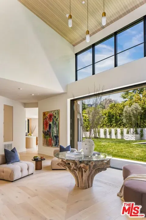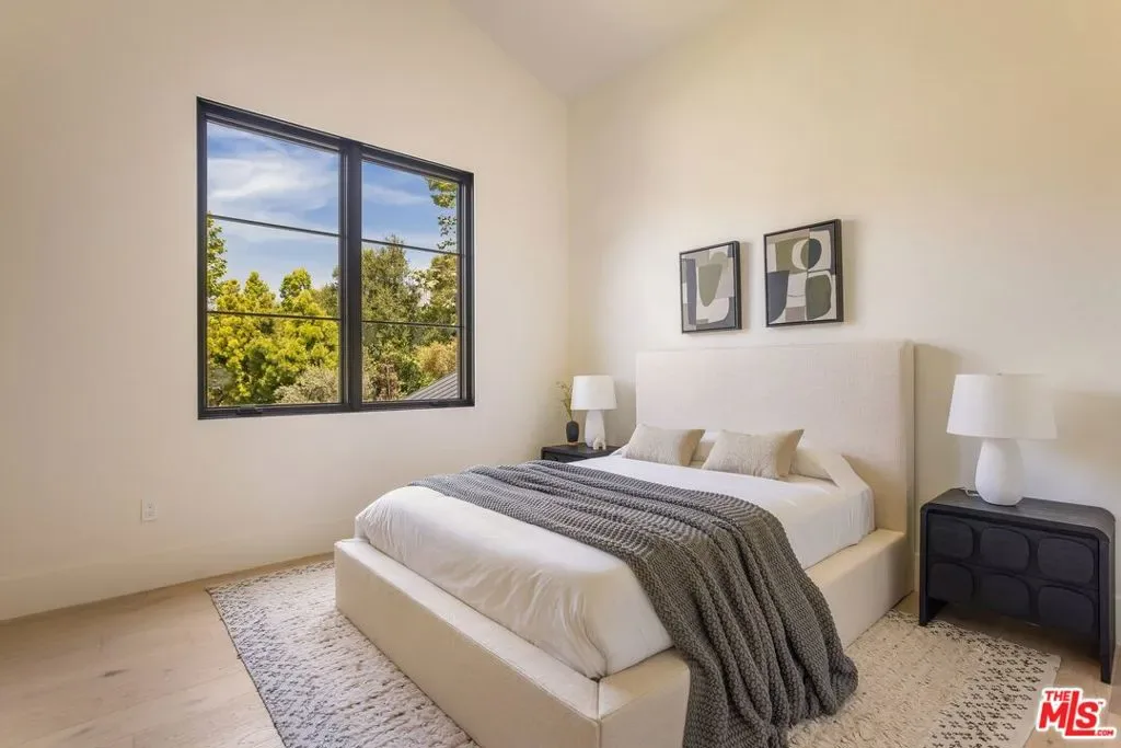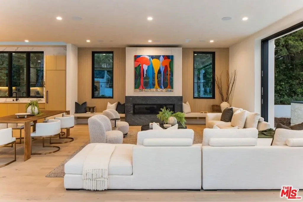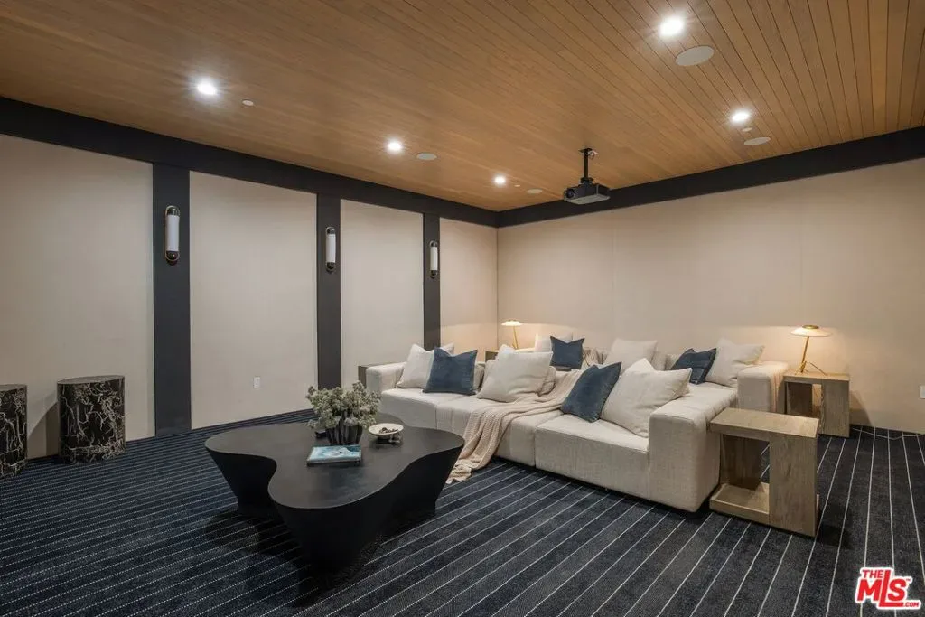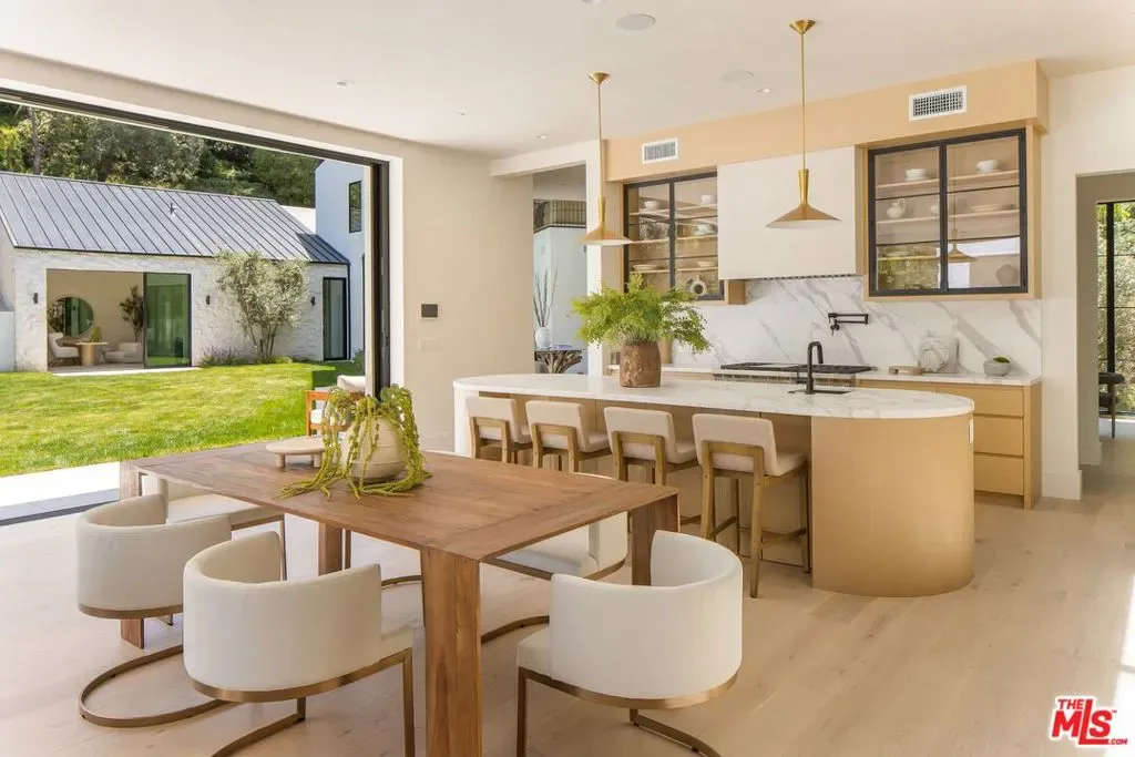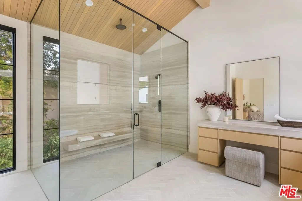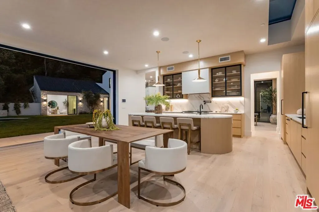 Nestled at the end of a quiet cul-de-sac on a tranquil lane just off the first block of lower Mandeville Canyon, this brand-new construction Modernist Farmhouse blends architectural sophistication with refined, organic design. Set on an expansive 18,000 square foot lot, this estate offers unparalleled privacy and sophistication in one of Brentwood’s most coveted neighborhoods. Crafted with meticulous attention to detail, the home’s handsome stone cladding and light wood accents seamlessly blend natural textures with contemporary design. A soaring two-story entry with exceptional volume welcomes you into a natural light-filled oasis, thoughtfully designed for both entertaining and everyday living. At the heart of the residence is an expansive great room with artisanal Roman clay ceiling, handsome Black Taj marble slab fireplace, and walls of pocketing Fleetwood glass doors leading to a resort-style backyard with elegant cabana and sparkling pool. Chef’s kitchen with Calacatta Aella marble finishes, state-of-the-art Sub-Zero and Wolf appliances, and an open-concept layout that ensures a seamless flow between the great room and formal dining room. Primary suite aerie with vaulted ceiling and elegant spa-inspired bathroom. Three additional bedroom suites up, each with luxurious baths showcasing Misterio marble finishes. Sophisticated downstairs powder room with artful, minimalist raked stucco walls. Captain of Industry office. Spacious state-of-the-art screening room delivers a cinematic experience, while the Control4 smart home automation and built-in surround sound ensure effortless control of lighting, climate, security cameras, and entertainment. Expansive walls bathed in diffused natural light for a serious art collection. A singular, Brentwood estate blending glamorous indoor/outdoor living, comfort, and unparalleled amenities.