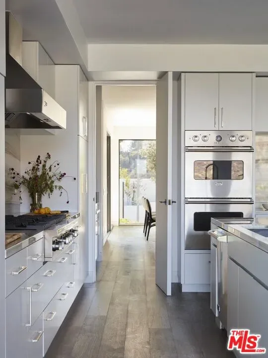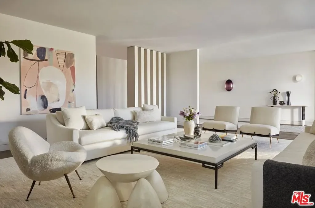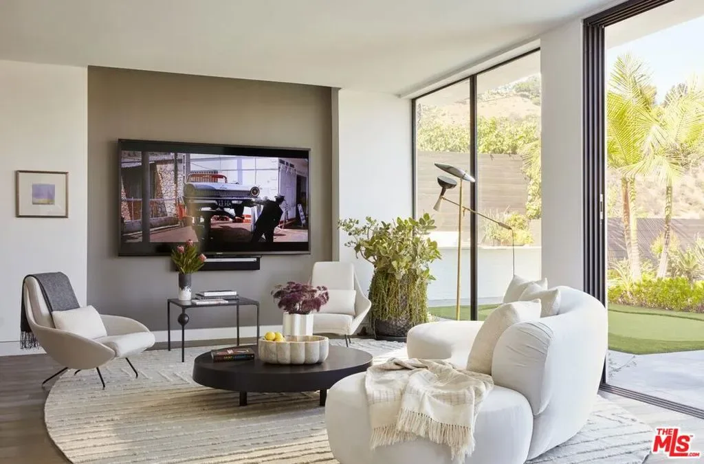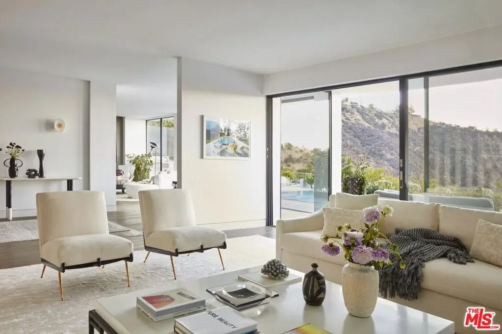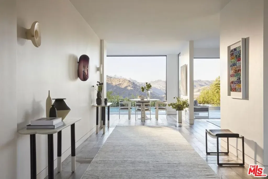 Located at the top of Stone Canyon Road, just minutes from the Hotel Bel-Air, this beautifully designed Mid-Century Modern home offers stunning views of the Stone Canyon Reservoir. Designed by renowned NYC designer Sara Story, the interiors combine modern elegance with timeless sophistication, creating a space that is both stylish and cozy. A formal art-gallery entrance leads to a bright, open floor plan with floor-to-ceiling Fleetwood doors, seamlessly connecting the indoor living spaces to a zero-edge pool and expansive glass-edged deck. The living and great rooms flow effortlessly outside, maximizing the home’s indoor-outdoor lifestyle. A fire pit on the deck offers a relaxing space to take in the views, while the outdoor BBQ area is perfect for entertaining. The formal dining room features city lights views alongside an impressive glass wine room, while a first-floor screening room delivers a state-of-the-art home theater experience. A private office offers a serene workspace. The chef’s kitchen is equipped with Viking appliances, Walker Zanger exotic marble countertops and backsplash, and a barbecue bar for outdoor cooking. The primary suite boasts stunning blue water views and a luxurious bath finished in Sea Pearl Quartzite. Upstairs, three additional bedrooms offer flexibility – one is perfectly suited for use as a gym or wellness space – while a first-floor guest suite ensures privacy and comfort for visitors. Arlo, Nest, and Sonos systems are integrated throughout, enhancing both convenience and functionality. A true Bel-Air retreat, this home offers breathtaking views, seamless indoor-outdoor living, and exceptional design.
