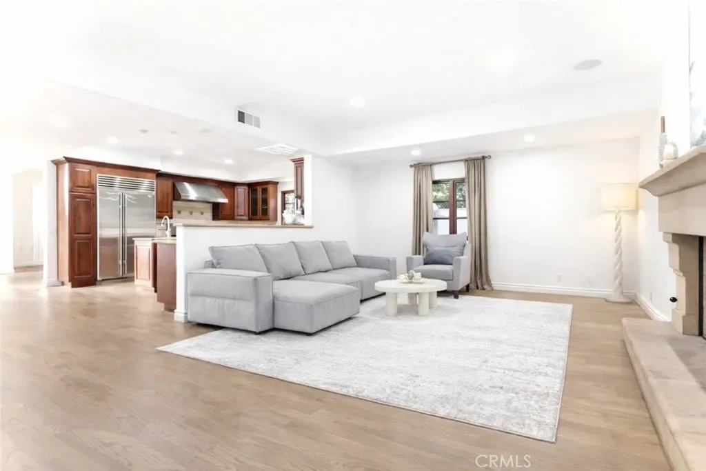 A grand foyer opens into sun-filled living spaces framed by soaring ceilings, graceful archways, and multiple sets of French doors that invite natural light and connect seamlessly to the outdoors. The formal living and dining rooms flow effortlessly into a spacious chef’s kitchen and adjoining family room, offering an ideal environment for both everyday living and elegant entertaining.