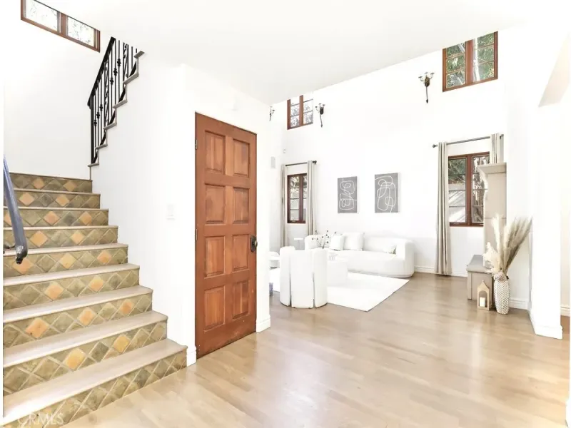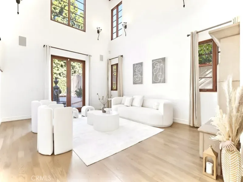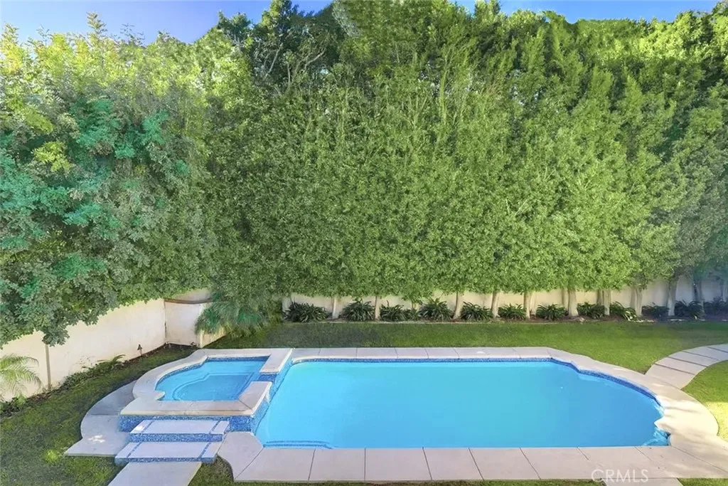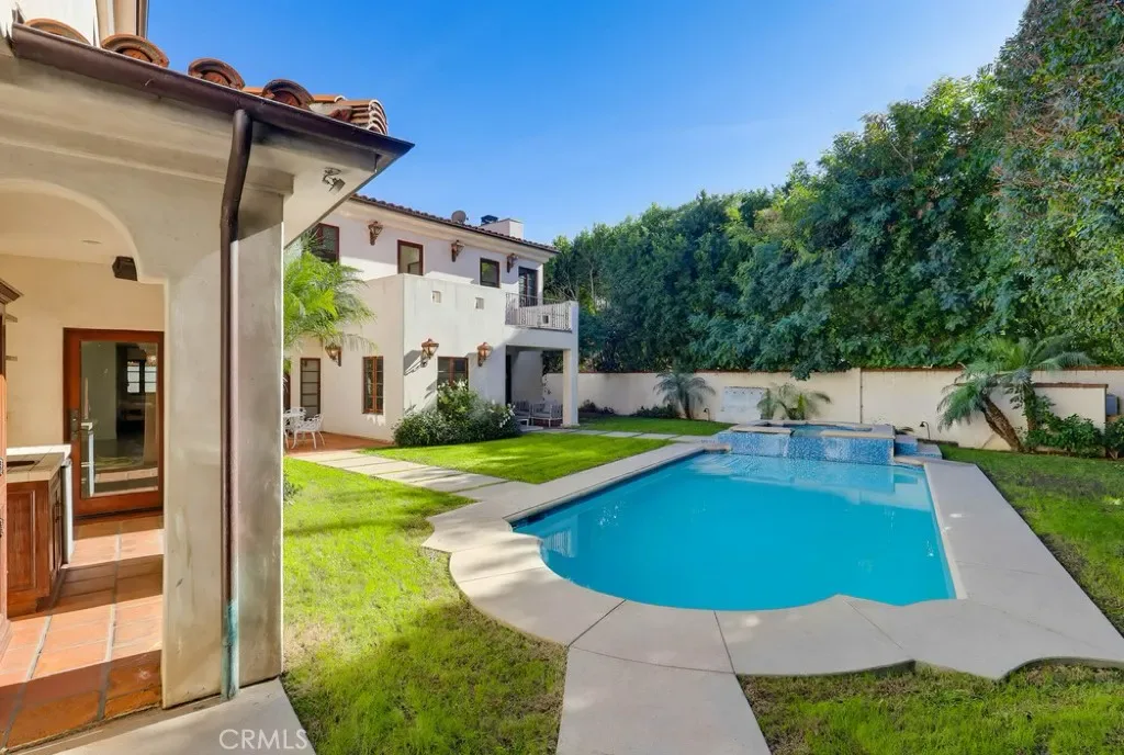 A versatile en-suite bedroom with its own entrance serves perfectly as an office, guest suite, or creative studio. Upstairs, generously scaled guest rooms accompany a serene primary retreat with vaulted ceilings, expansive closet space, and a spa-inspired bath. The backyard is the home’s crown jewel—a true resort-style sanctuary with a large pool, spa, fire pit lounge, and full outdoor wet bar, all wrapped in lush greenery that ensures exceptional seclusion rarely found in this central Hollywood location.