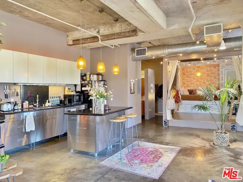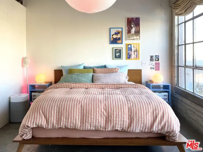 Toy Factory live/work industrial loft in the heart of the highly desirable Arts District. This unique 3rd floor CORNER loft features 1418sf of space, with 11-foot tall ceilings, concrete floors, and massive vintage factory windows with a northeast balcony off the open plan living area. This true industrial loft features a separated main bedroom with closet storage with built-ins, platformed reading/workspace nook, and spacious bathroom with washer and dryer. Ideal as a flexible creative space. The open plan kitchen features a stainless steel island with additional storage, and flows into the living/dining area. The living area features a glass casement door that leads out onto a balcony, extra hidden storage behind barn doors, and a great flexible layout. Central heat and AC throughout. Rent INCLUDES 2 TANDEM COVERED PARKING SPACES w/ EV charger, water and trash. The beloved Toy Factory building features a stunning rooftop pool deck and cabanas, 360 degree views of DTLA, garden and lounge deck with BBQs, gym, 24/7 front desk reception, and in-building parking. You’re within blocks of the best of the Arts District, including Soho House, award-winning Camelia, Bestia, Verve, The Girl & Goat, Bavel, Urth Cafe, Manuela, Hauser & Wirth, Geffen Contemporary, A&D Museum, Hanks, GROW market, Hennessy & Ingalls, Salt & Straw, Dover Street Market, Sci-Arc, Bread Lounge, as well as nearby Little Tokyo and Disney Concert Hall, The Broad, Grand Central Market and more.