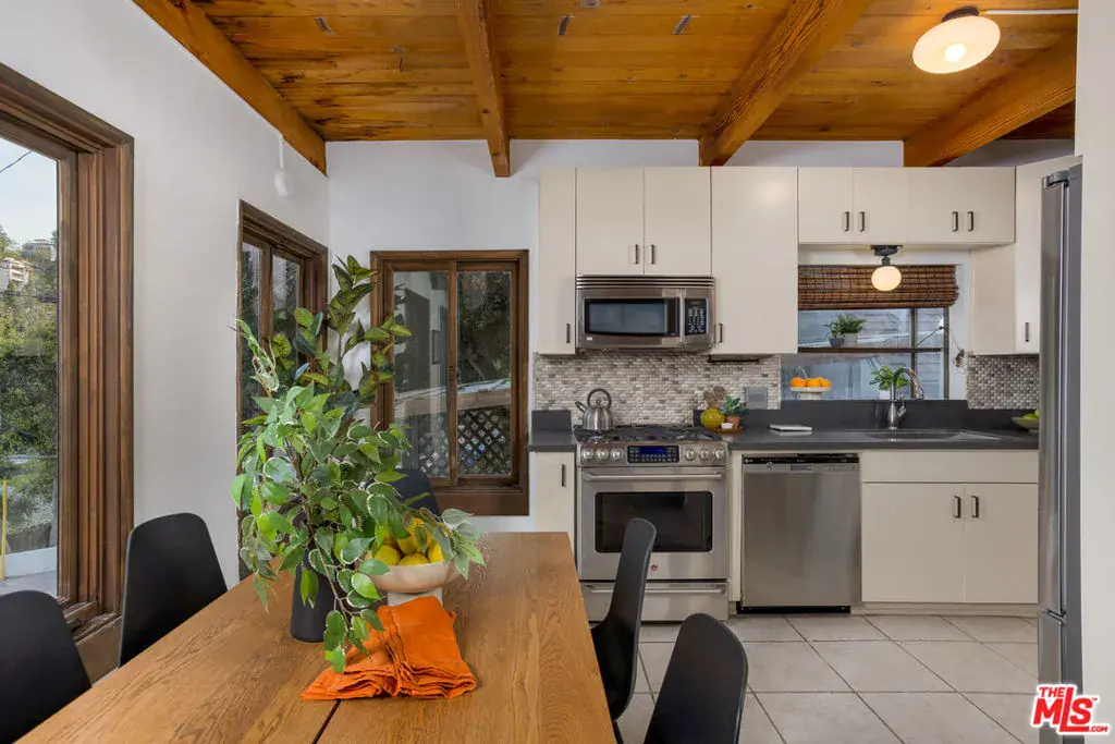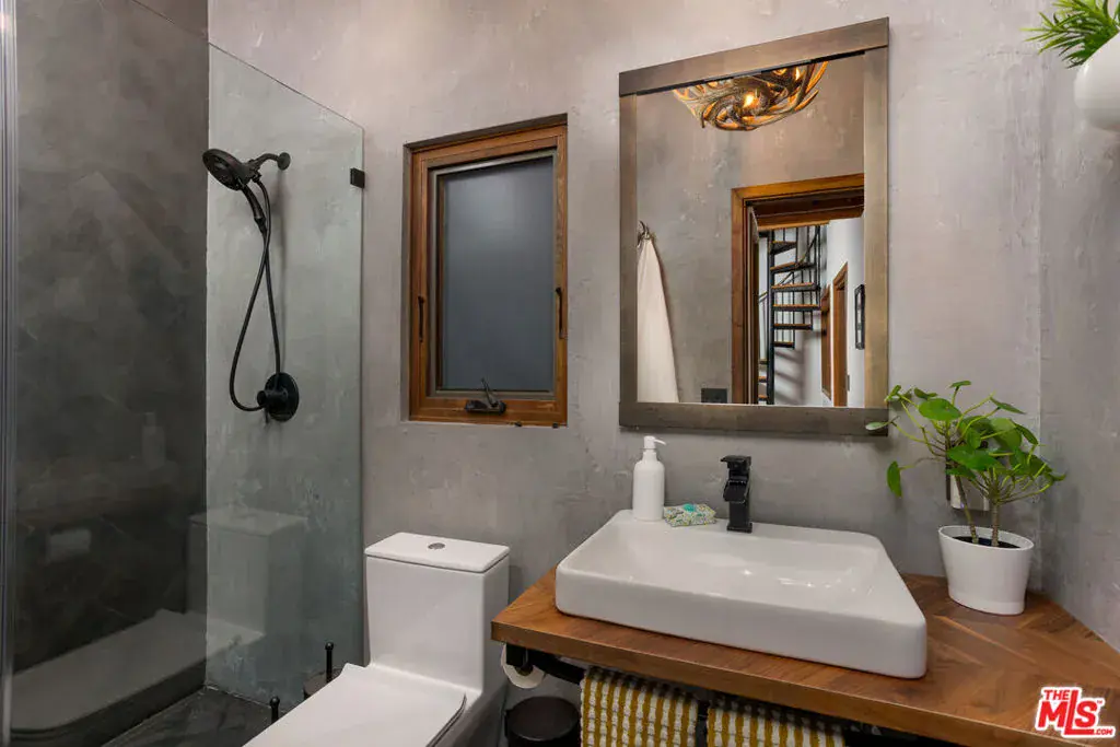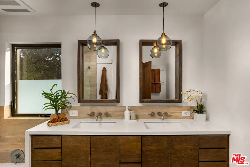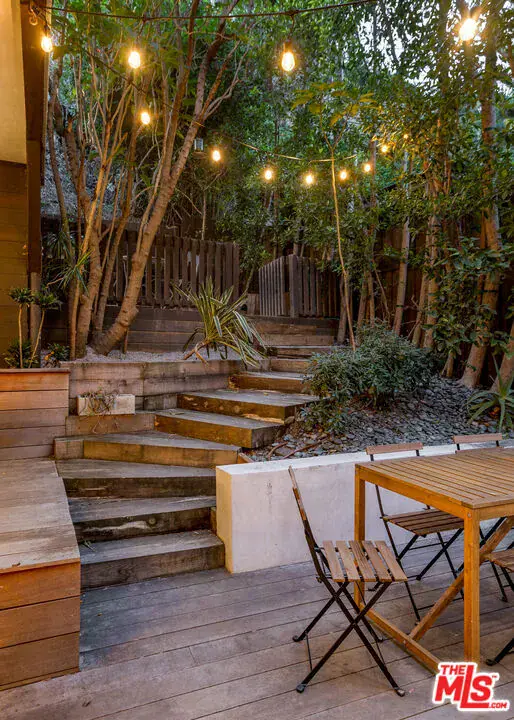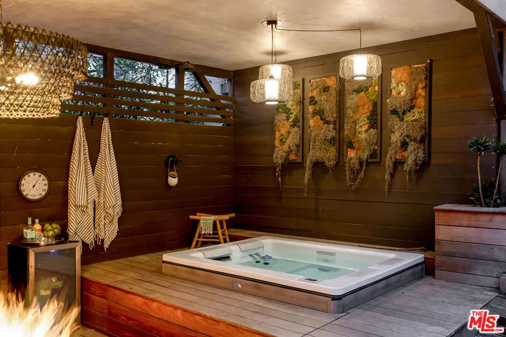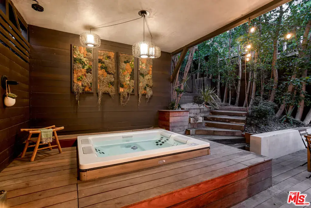 Welcome to 1905 Weepah Way, a serene retreat tucked away in Laurel Canyon. This contemporary Craftsman-style “treehouse” blends rustic warmth with modern updates, featuring renovated kitchen and baths, soaring lofted ceilings, and an abundance of natural light throughout. The open-concept living and dining area is anchored by a cozy fireplace and expansive windows that frame lush canyon views. The updated gourmet kitchen is equipped with high-end stainless steel appliances, generous cabinetry, and ample storage. A full modern bathroom completes the main living level. French doors open to a private, secluded outdoor oasis ideal for entertaining or relaxing, featuring multiple lounge areas, outdoor dining space, and a spa jacuzzi with outdoor shower surrounded by mature greenery. An additional upper patio offers space for gardening or quiet retreat. The upper level hosts three large bedrooms and a sleek full bathroom with double vanity and sunken soaking tub. The lower level includes a fully renovated full bathroom and a bonus bedroom with closet, ideal as a guest suite, office, or flexible living space. Additional highlights include owned, paid-off solar panels, a detached laundry room, a converted garage that has been semi sound-proofed perfect for music, creative work, or editing and placement within the highly sought-after Wonderland Avenue Elementary School district. A Must See!!