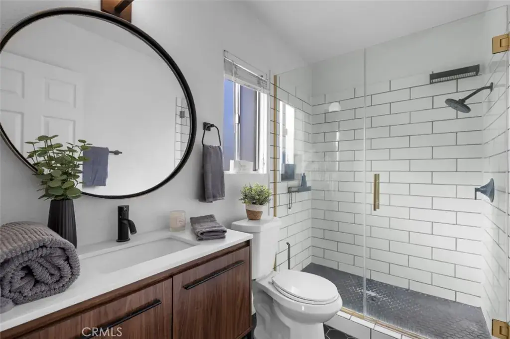 an updated kitchen with Silestone countertops, stainless steel appliances and custom cabinetry, a relaxing primary suite including a large walk-in closet, a spa-inspired bathroom with walk-in shower, and crisp architectural lighting and details throughout.