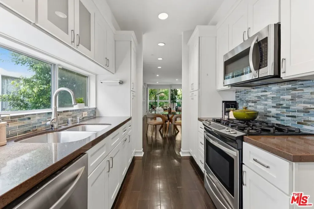 Nestled in a prime & central location, this one story 2-bedroom, 2-bathroom condo effortlessly combines modern updates with a sense of tranquility. Floor-to-ceiling windows frame the living room, offering treetops views on the east and north sides, bathing the space in soft, filtered light, especially during the morning. It’s the perfect space to greet the day and come home to. .The updated kitchen boasts sleek newer cabinets, countertops, and appliances, making it as functional as it is stylish. The formal dining room provides flexible options whether you’re hosting dinner parties, setting up a home office, creating a playroom, or carving out a family TV room. The primary bedroom is a true retreat, complete with a cozy fireplace, a generous walk-in closet, and plenty of room for a sitting area or desk. The ensuite bathroom features a new soaking tub, separate glass enclosed shower and duel vanity sinks. The 2nd bedroom also features lots of storage space. Both bedroom closets are designed with the Elfa modular system maximizing both space and storage. The second bathroom is full-sized, ideal for guests or family use. Conveniently located just off Westwood Boulevard and around the corner from the ever-popular House of Bread! Close to UCLA, Century City, and with easy access to the 10 freeway, this condo offers unbeatable accessibility to some of the best shopping, dining, and entertainment around. This property is within walking distance of Westwood Charter Elementary School. Move-in ready and newly painted, this home is waiting for you to make it your own!